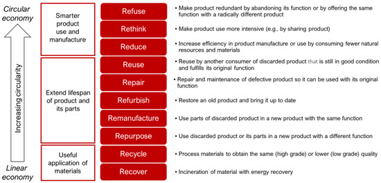 The R-strategies are categorized into three groups. The first group (R0–R2), which includes refuse, rethink, and reduce, focuses on smarter product use and manufacturing, aiming to eliminate waste early in the product life cycle [30]. Refuse addresses harmful products, rethink encourages seeing waste as a resource, and reduce works towards raw material efficiency.