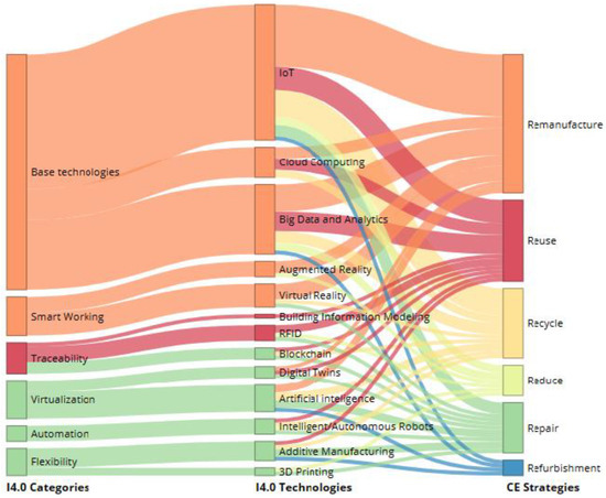 Sankey chart—Enabling technologies and circular economy strategies. Note: Each color represents a CE Strategy as follows: Orange: Remanufacture, Red: Reuse, Yellow: Recycle, Light Green: Reduce, Green: Repair, and Blue: Refurbishment.