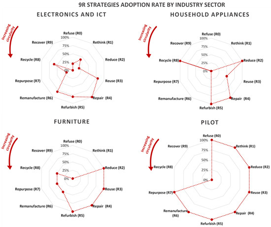 The literature outlines a hierarchy of the 9R strategies for achieving CE, with strategies focused on smarter product use and manufacture (R0–R2) being the most valuable, followed by strategies extending product lifespan (R3–R7), and finally, strategies for the useful application of materials (R8–R9) [21]. The organisations studied loosely follow this hierarchy, with all implementing strategies related to product lifespan extension, while fewer have adopted smarter product design and manufacture or useful material application strategies, as shown in Table 3. From the 9R framework, the studied cases adopted between a minimum of four and a maximum of eight circular economy strategies (see Table 3), indicating that businesses often implement multiple approaches at once. Figure 4 shows the adoption rates of the 9R Framework across the three sectors (electronics, household appliances, furniture), compared to the pilot case.