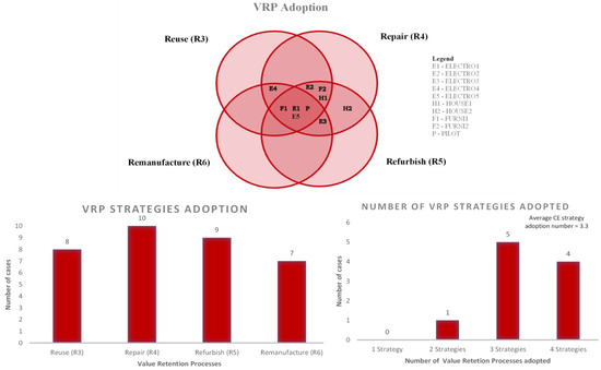 Figure 5 presents three elements related to the adoption of value retention processes (VRPs). The Venn diagram at the top shows how organisations adopt reuse (R3), repair (R4), refurbish (R5), and remanufacture (R6) strategies. The overlaps indicate cases where firms combine two or more strategies. For example, cases E1, E5, F1, and P appear at the intersection of all four strategies. The bar chart on the lower left reports the number of cases for each VRP strategy. Repair (R4) appears in ten cases, refurbish (R5) in nine, reuse (R3) in eight, and remanufacture (R6) in seven. The bar chart on the lower right shows how many strategies each organisation adopted. No firm adopted only one strategy, one firm adopted two strategies, five firms adopted three strategies, and four firms adopted four strategies. The average number of strategies adopted equals 3.3.