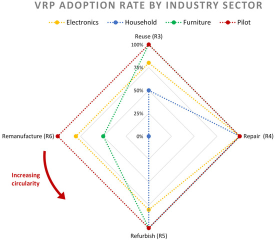Figure 6 illustrates the adoption rates of four circular economy strategies—reuse (R3), repair (R4), refurbish (R5), and remanufacture (R6), collectively referred to as VRPs—across the pilot case and the three industrial sectors: electronics, household appliances, and furniture. The pilot case stands out as the most advanced in terms of circularity, demonstrating a 100% adoption rate across all four VRPs. The electronics sector follows, with relatively high adoption rates, particularly for repair (R4). In contrast, the furniture sector exhibits a different adoption profile. While repair (R4) and refurbish (R5) show strong implementation, remanufacturing (R6) is less prevalent. Finally, the household appliances sector demonstrates the lowest adoption rates, particularly showing no implementation of remanufacturing (R6). This can be explained by several barriers, such as the lower economic value of individual appliances, the difficulty of disassembly and reassembly due to integrated design, and the absence of dedicated infrastructure for remanufacturing. Furthermore, safety and regulatory concerns in dealing with refurbished electrical components may also deter remanufacturing efforts in this sector.