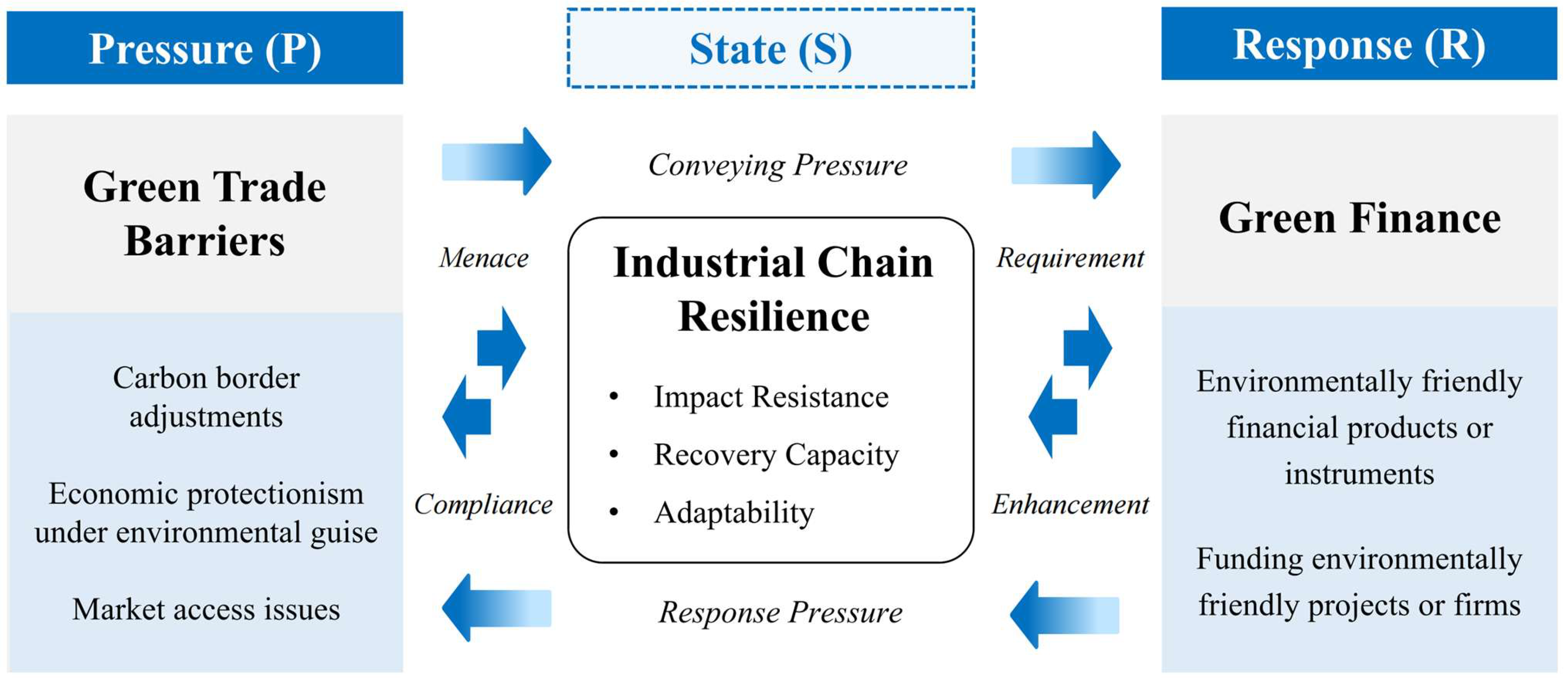 Figure 1). This framework aims to elucidate how environmental pressures represented by green trade barriers, may influence the system state that is industrial chain resilience, and how green finance functions as a key response mechanism to mitigate shocks and facilitate adaptation.