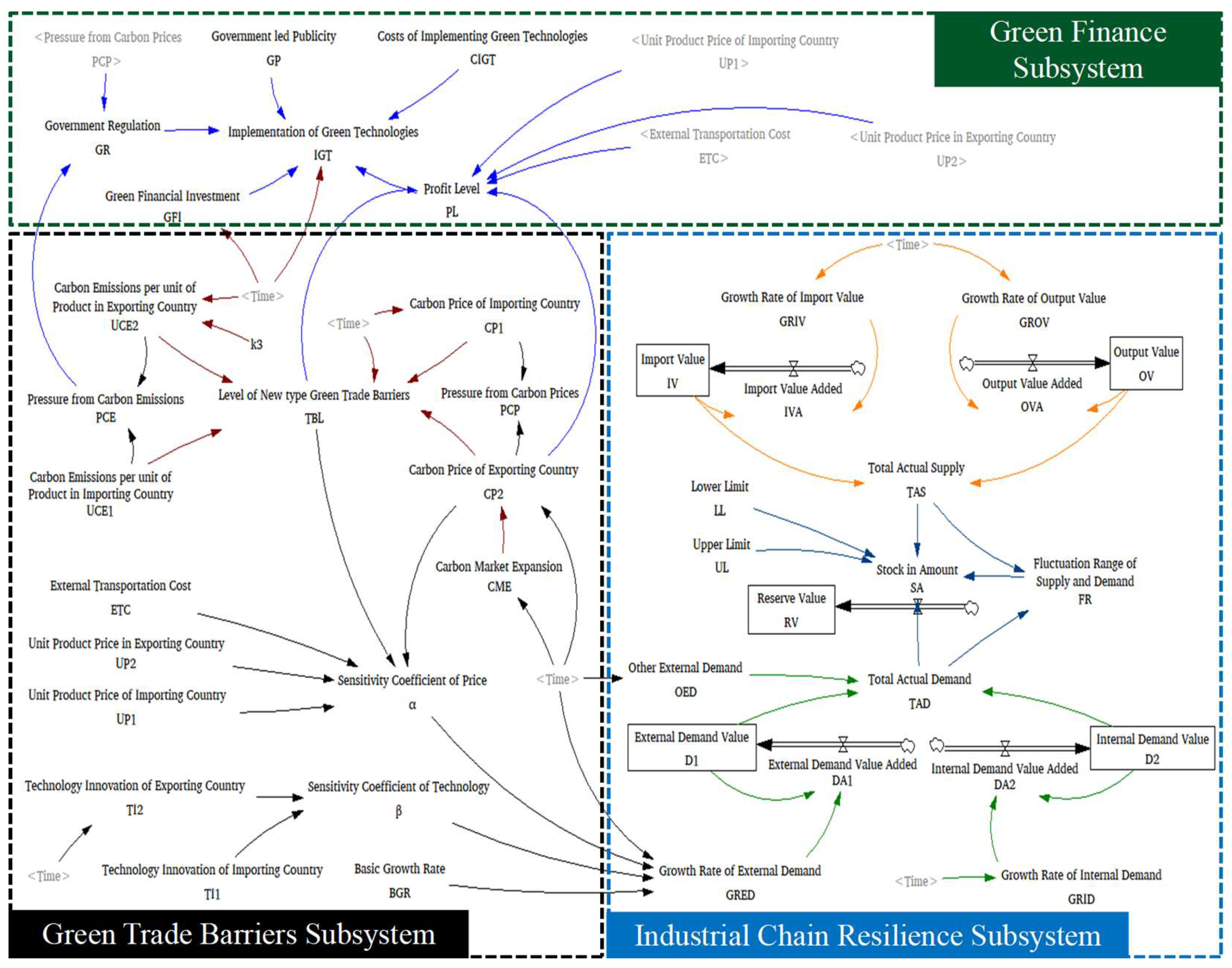 Furthermore, when exploring industrial chain resilience, while it is important to account for extreme events (such as the pandemic, natural disasters, and conflicts) and various obstacles to the implementation of green finance, these issues fall beyond the scope of the present study. As such, the simplified system structure does not capture these factors or their precise interlinkages. For the purposes of this research, the overall system is therefore divided into three subsystems: the green trade barrier subsystem, the industrial chain resilience subsystem, and the green finance subsystem.