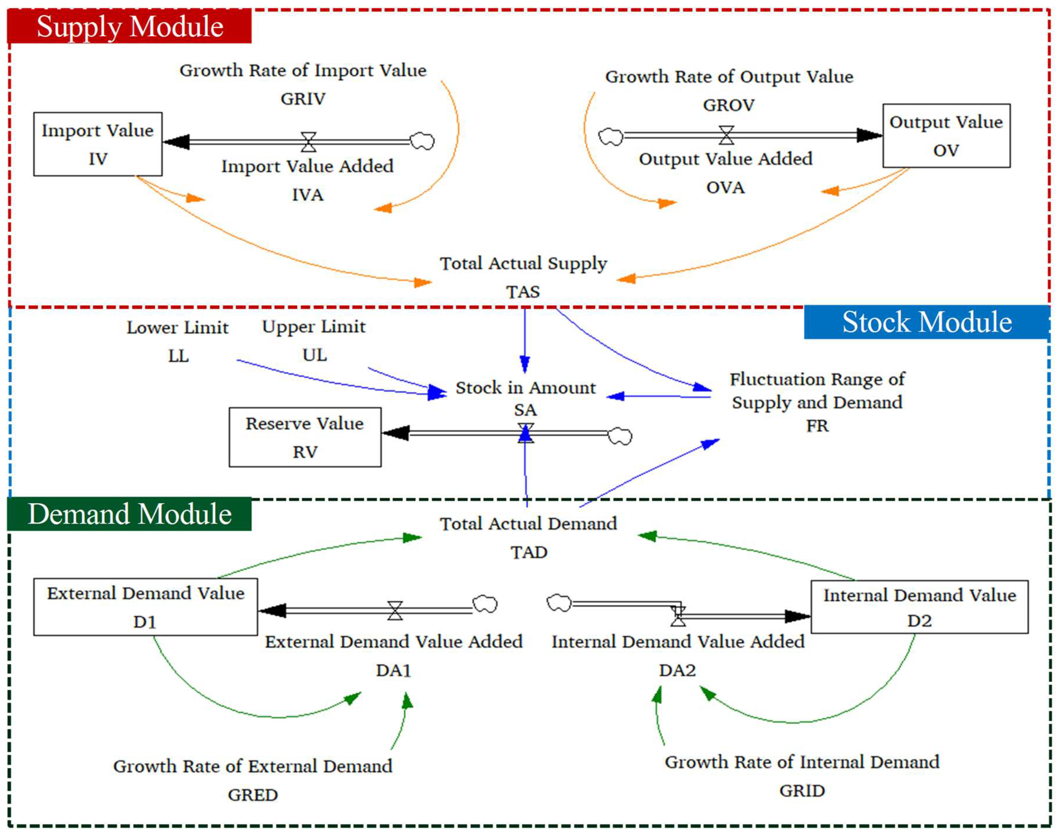 In alignment with this study’s definition of industrial chain resilience, our simulation process focuses on the impact resistance, recovery capacity, and adaptability of China’s steel industry chain. These dimensions are measured using Fluctuation Range of Supply and Demand (FR), Stock in Amount (SA), and Implementation of Green Technologies (IGT). Specifically: