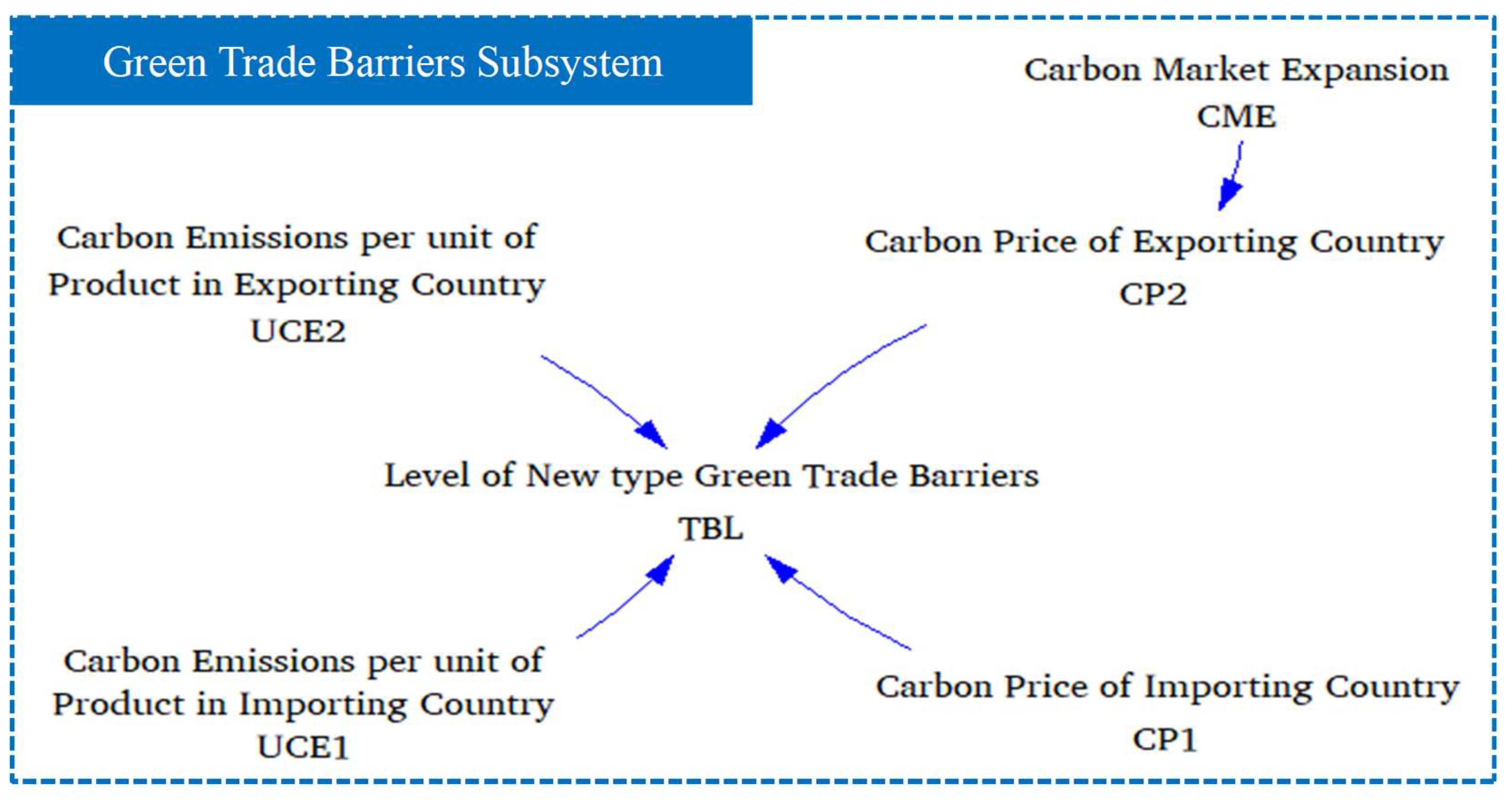To ensure the reliability of the SD model, five assumptions are proposed based on existing literature and practical industry insights: (1) The intensity of green trade barriers increases, and their coverage expands over time. (2) There are differences between economies in carbon market prices and industry-average carbon emission levels. (3) Owing to the rapid development of information technology and the presence of numerous third-party service providers, the response lags of governments and industries to emerging green trade barriers can be regarded as negligible. (4) In scenarios involving the payment of carbon border taxes, other domestic demand and supply shocks arising from geopolitical issues are simplified for the purposes of this study, with the potential to incorporate them in future research. (5) Given the large number of firms in the industrial chain, the complexity of transport routes, and constraints on data availability, transportation costs are restricted to cross-border shipments from the exporting country to the importing country, while domestic logistics are excluded.