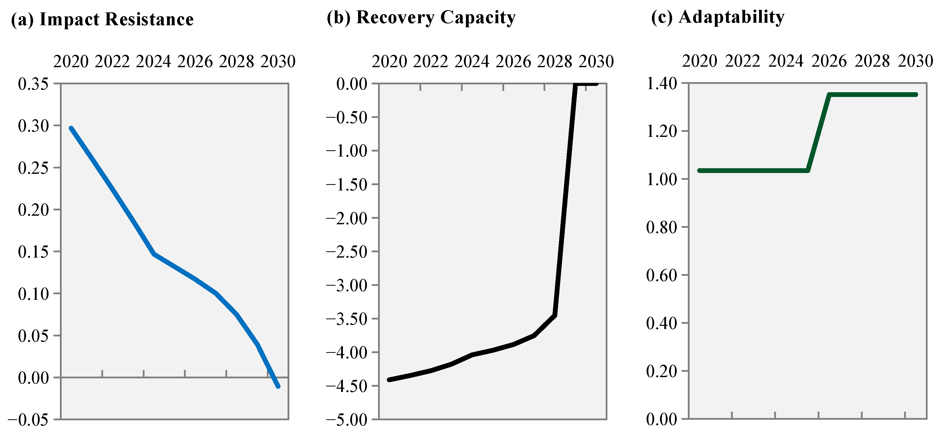 Second, recovery capacity exhibits a gradual upward trend. It remains negative between 2020 and 2028 but improves, turning positive after 2029, as illustrated in