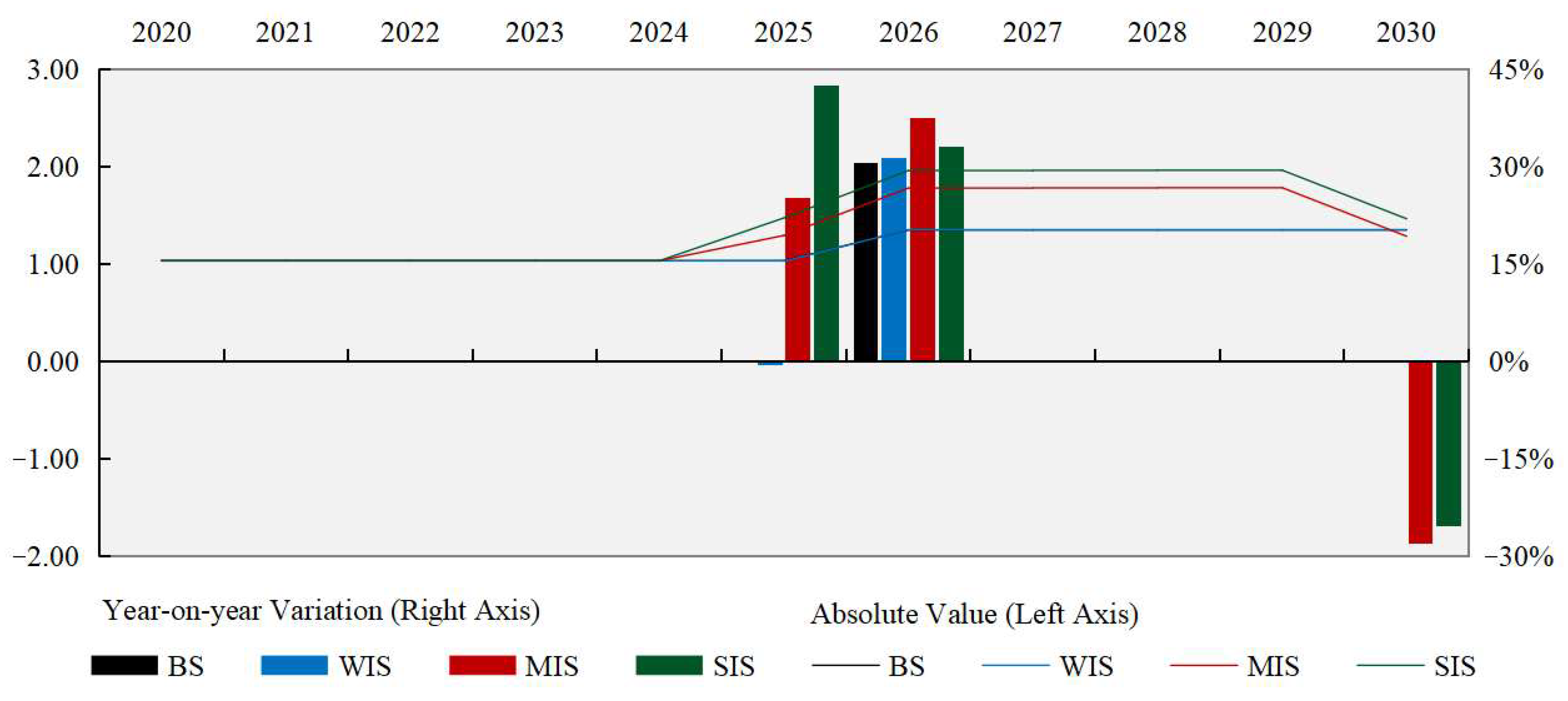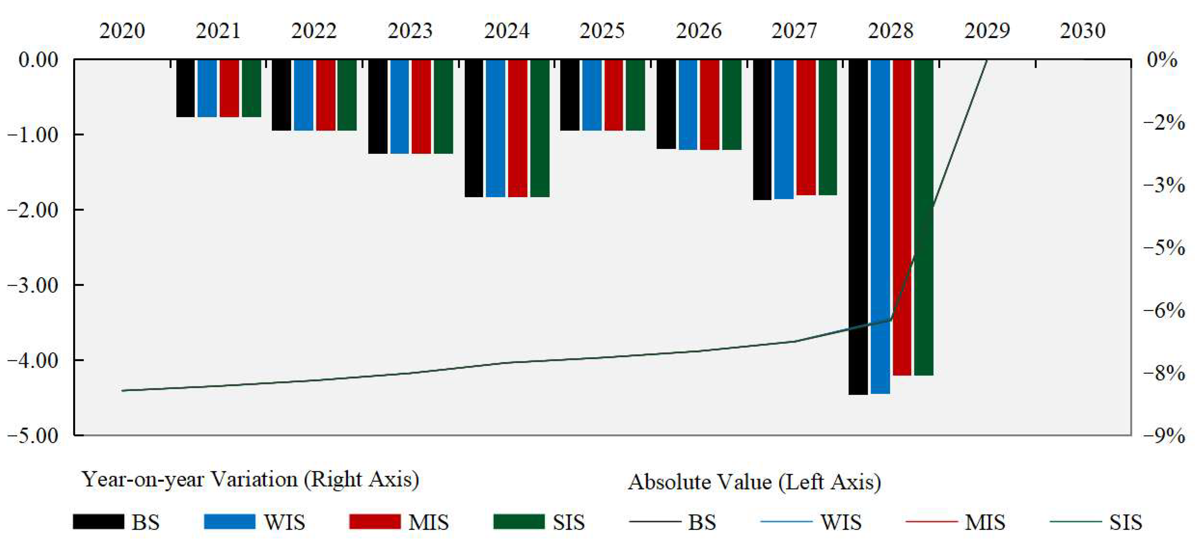 Figure 7. Over the decade, the impact resistance of China’s steel industrial chain is projected to decline gradually overall. While differences across intervention scenarios are relatively modest, they still yield valuable insights. In absolute terms, impact resistance decreases year-on-year under all scenarios, falling from 0.30 in 2020 to negative values by 2030. However, by 2030, MIS and SIS exhibit relatively higher impact resistance compared with BS and WIS, with year-on-year change rates following comparable trends.