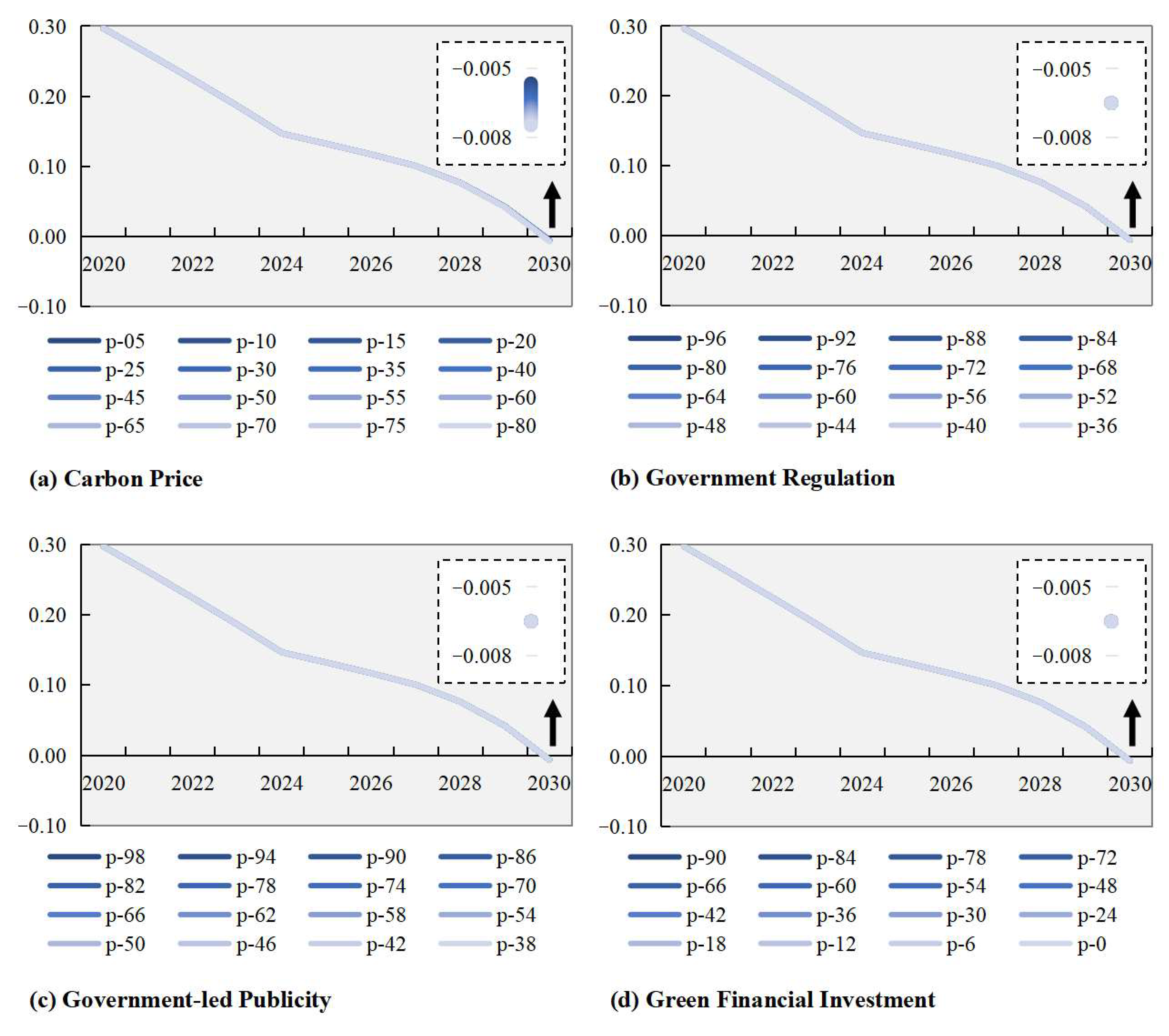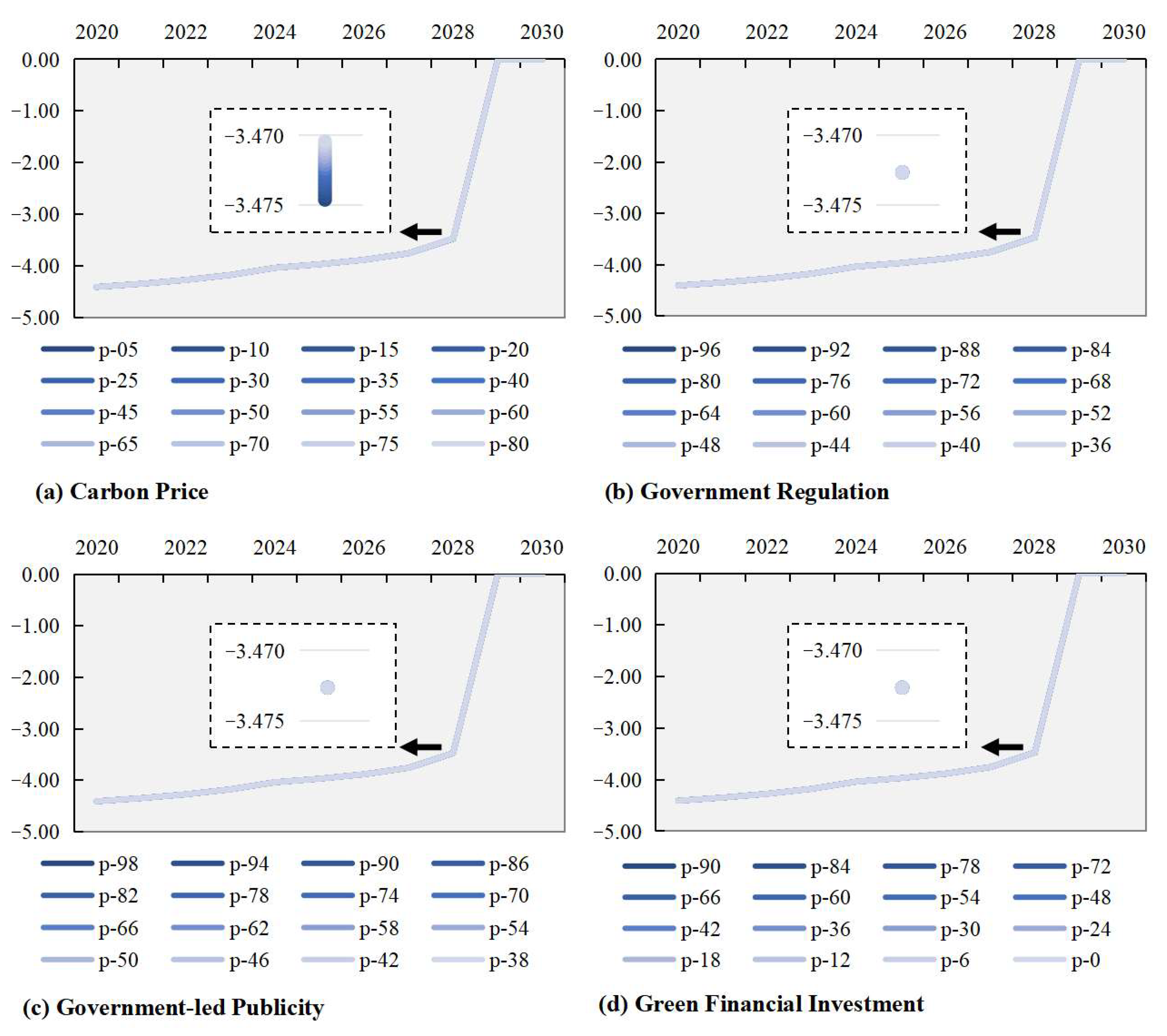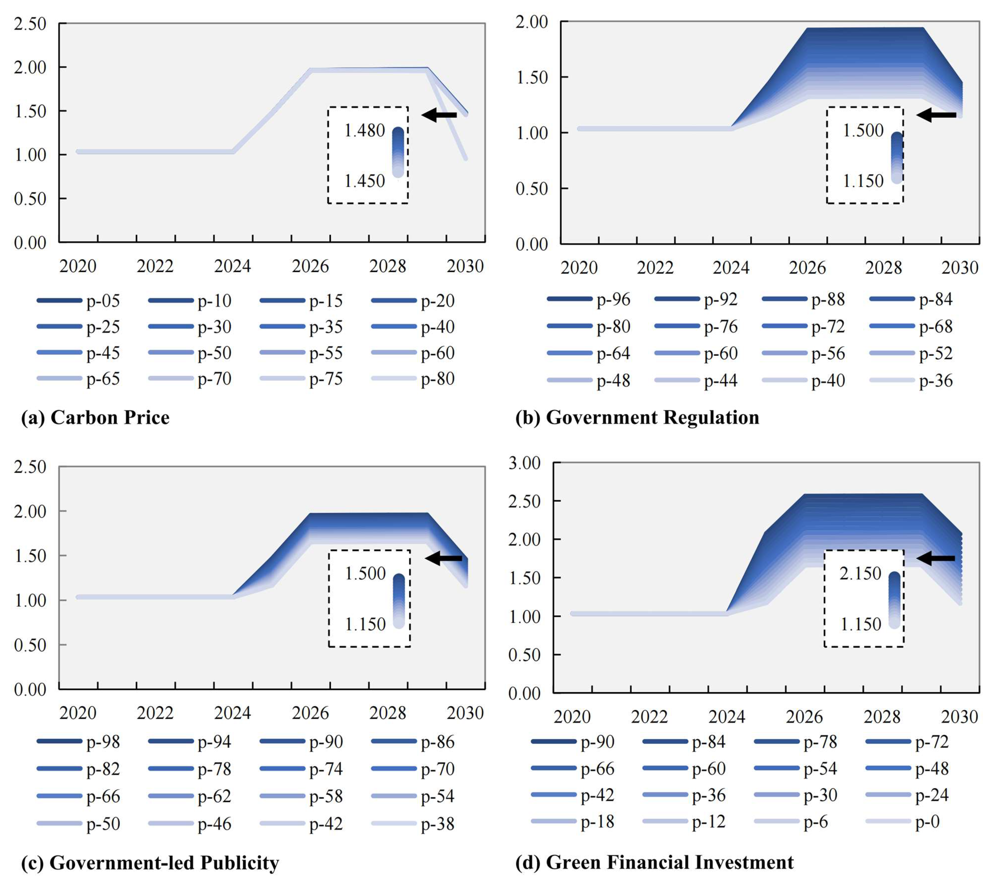 Figure 12. Unlike impact resistance and recovery capacity, the effects of different instruments vary significantly. Carbon price exhibits relatively limited sensitivity, but government regulation and government-led publicity both exhibit a more linear upward trend in adaptability, particularly pronounced between 2025 and 2028. Of the two, government-led publicity demonstrates slightly greater marginal improvement. This may be because it reinforces green behaviour not only through institutional pressure but also via cognitive and social pressures. Notably, green finance investment exhibits the highest sensitivity. This likely reflects green finance’s direct influence on the availability of funding, which significantly enhances enterprises’ capacity to implement green transformations. Overall, green finance has the most pronounced marginal effect on adaptability, followed by government regulation and government-led publicity in the medium term. Carbon price, by contrast, primarily affects long-term outcomes, with some certain influence. These results suggest that policy mix design must carefully consider the temporal dynamics and sensitivity of different instruments to achieve more robust improvements in adaptability.