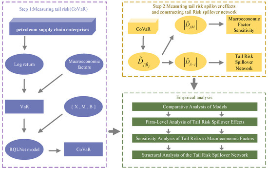 As a key pillar of the global energy system, oil exerts substantial influence over macroeconomic performance and geopolitical developments [1]. As one of the most important global energy commodities, oil price volatility affects energy costs and inflation. It also generates systemic shocks across economies through trade, investment, and financial channels [2,3,4,5]. With the acceleration of the global push toward carbon neutrality and the ongoing energy transition, oil’s carbon risk profile has become more salient. Its prices and demand exhibit heightened sensitivity to green policies, climate-related shocks, and geopolitical conflicts [6,7]. Oil enterprises span exploration, production, transportation, refining, and marketing. They perform key resource-allocation functions in international energy markets and serve as a critical hub for risk transmission between the industrial supply chain and the financial system [8]. As traditional energy enterprises, these enterprises face price-volatility pressures from deepening energy financialization. Under emission constraints and the green transition, they also face uncertainty in operations and asset values [9,10]. Petroleum supply chain enterprises are vulnerable to external shocks and can significantly affect other industries under extreme scenarios [11]. Therefore, accurately measuring tail risk spillovers among petroleum supply chain enterprises is crucial. It helps elucidate risk transmission in energy markets, assess carbon-risk exposure, and safeguard industrial stability as well as financial-system security.