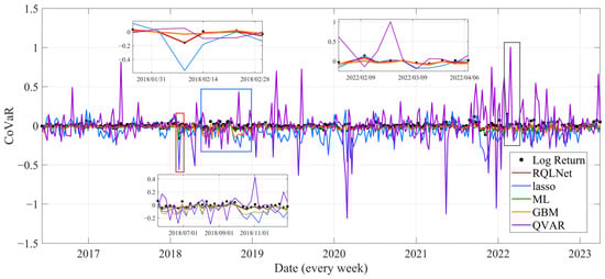 Figure 3 compares measurements of five models of tail risk (). A large body of research [46,47,48] uses Quantile Vector Autoregression (QVAR) to identify tail risk spillovers; however, QVAR is mainly suited to low-dimensional settings, and its estimation stability and coverage decline markedly in high-dimensional environments, as also seen in Figure 3. To alleviate high dimensionality, many studies [49,50,51] introduce Lasso with quantile regression to induce sparsity and enhance interpretability, yet Figure 3 shows that its calibration for tail risk measurement in high dimensions remains insufficient. By contrast, the Gradient Boosting Machine combined with quantile regression achieves higher point accuracy than the preceding two, but when tail sparsity, conditional heteroskedasticity, and temporal dependence coexist, the tree model’s high variance and piecewise, discontinuous approximation more readily lead to an overshoot of conditional quantiles, so the estimated tail risk exceeds the realized level and violations occur [52]. In comparison, the machine learning model integrating quantile regression proposed by Chen et al. [19] () markedly improves accuracy in high-dimensional samples and reduces overfitting, albeit with some shrinkage in spillover weights. Building on these developments, the proposed in this paper further raises overall measurement accuracy—especially achieving a closer fit to realized returns in non-tail periods—while effectively avoiding excessive penalization of spillover weights, thereby attaining a better trade-off between accuracy and structural robustness.