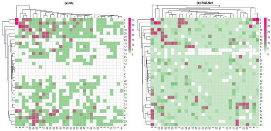 Heatmap of aggregate tail risk spillover weights across all nodes during the sample period: (a) ; (b) .