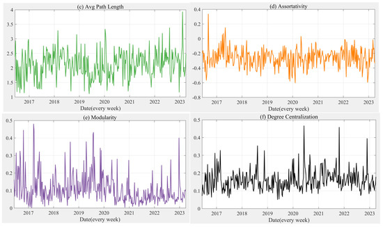 Network-level indicators of overall tail risk spillover characteristics: (a) Density; (b) Average clustering coefficient; (c) Average path length; (d) Assortativity; (e) Modularity; (f) Degree centralization.