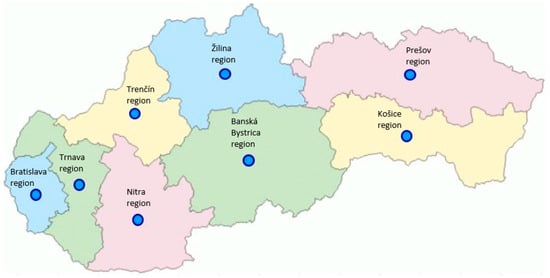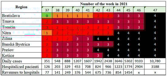 The data were processed in weekly intervals for all regions of Slovakia. Sources included the Epidemiological Information System (EPIS) and records from the Public Health Authority of the Slovak Republic, which provided continuous updates on the development of the pandemic situation at the district level [].