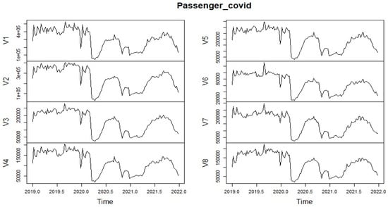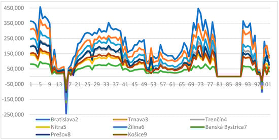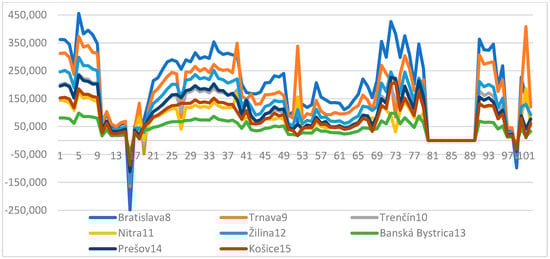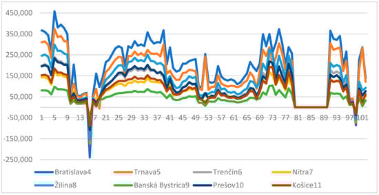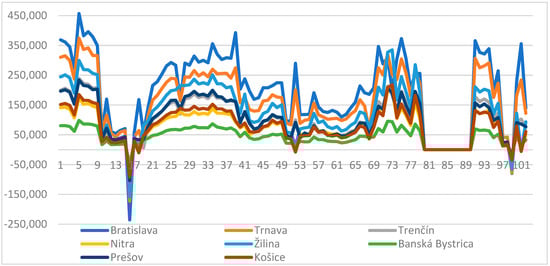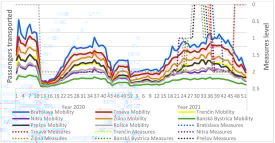 The number of passengers showed a similar trend across individual regions (V1—Bratislava, V2—Trnava, V3—Trenčín, V4—Nitra, V5—Žilina, V6—Banská Bystrica, V7—Prešov, V8—Košice). This was primarily because, from the beginning of the pandemic, identical measures were introduced nationwide. Only from 2021 onward were measures applied at the regional level, and even then, the differences between regions remained very small. In this form, the adapted database provided a robust foundation for modelling the relationship between pandemic-related measures and the development of mobility in rail passenger transport.
