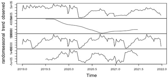 As shown by the results of the stationarity test, p < 0.05, and therefore the null hypothesis was rejected (H0: the time series is stationary). This confirmed the non-stationary nature of the dataset, further justifying the need for decomposition prior to modelling. Figure 5 presents the decomposition of the passenger transport time series into its individual components for the Bratislava region, illustrating the separation into trend, seasonal, and random parts.