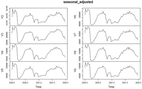 Figure 5 shows the components of the time series from top to bottom—original data, trend, seasonal component, and random component. Analogous decompositions of the time series were carried out for all regions. Figure 6 presents the seasonally adjusted passenger transport data, which remove recurring seasonal effects and allow a clearer comparison of mobility trends across regions.