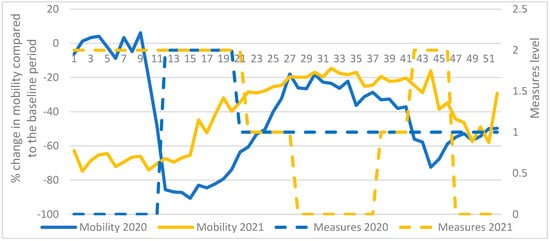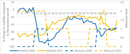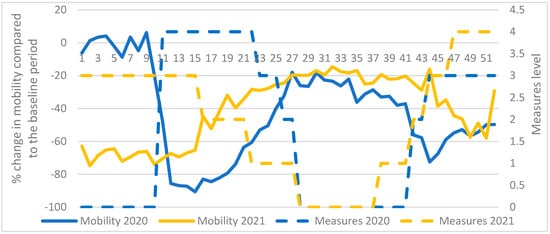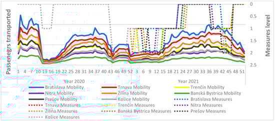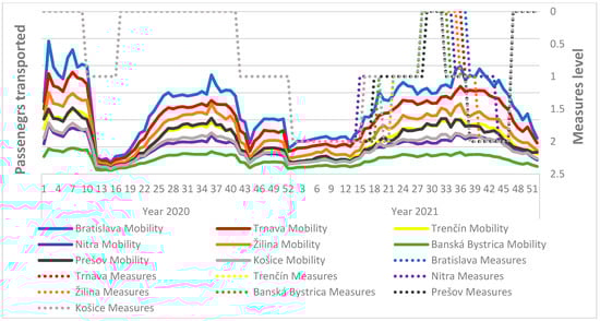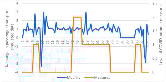 Nevertheless, the study has certain limitations. First, the model was built on binomial variables representing the tightening or relaxation of measures, which cannot fully capture the heterogeneity and complexity of real-world restrictions. Second, the analysis relied on aggregated weekly data, which may conceal short-term fluctuations in mobility. Third, the regional focus on Bratislava, while justified by its role as the country’s most important commuting hub, constrains the generalizability of the findings to regions with different mobility structures.