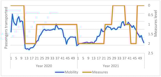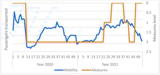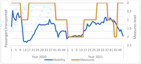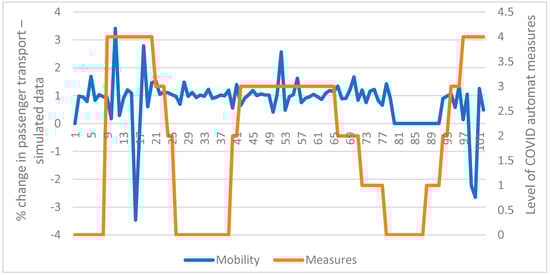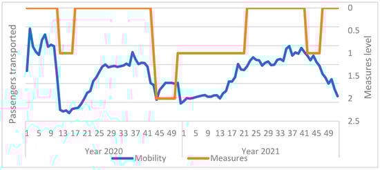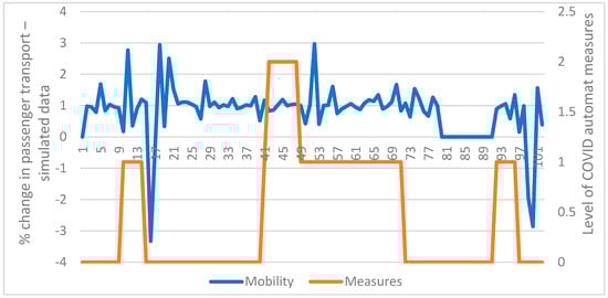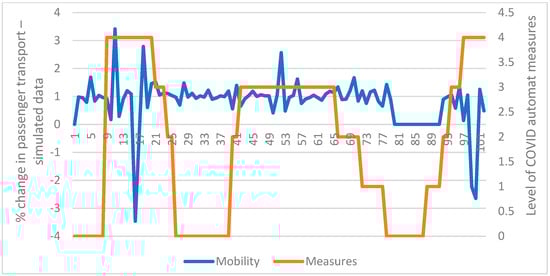 Accurate forecasting of transport demand during a pandemic or other extraordinary situation is therefore an essential prerequisite for effective decision-making by transport authorities. Modelling population mobility while accounting for the dynamics of restrictive measures not only provides deeper insights into passenger behaviour [] but also enables the design of interventions aimed at reducing social costs and optimizing the operation of the transport system [,].