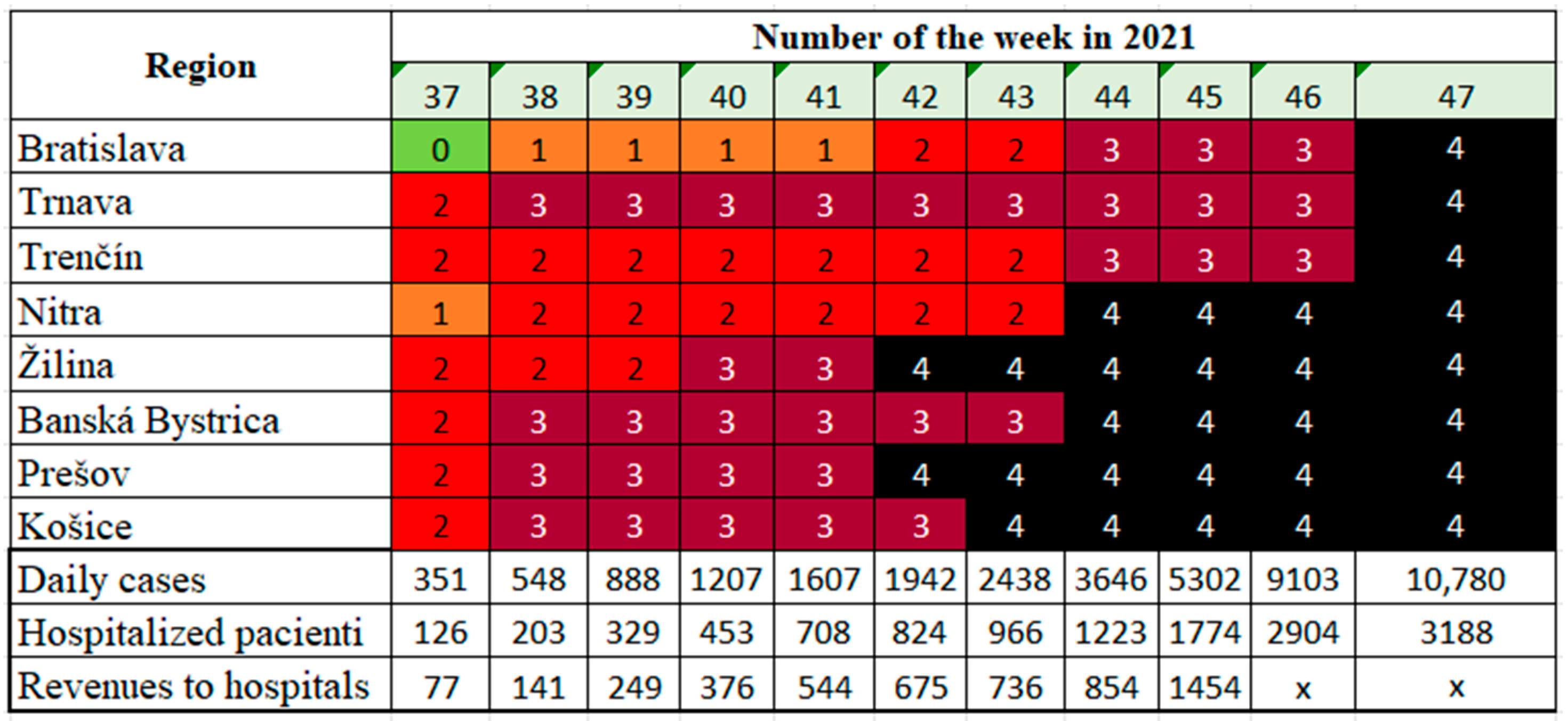 During the COVID-19 pandemic, several nationwide measures were introduced in the Slovak Republic to limit the spread of the virus. Since 2021, the so-called COVID automat (it is a government traffic-light system defining the intensity of restrictions based on the epidemiological situation in individual districts) was applied. This tool represented the primary source of qualitative data for our research.