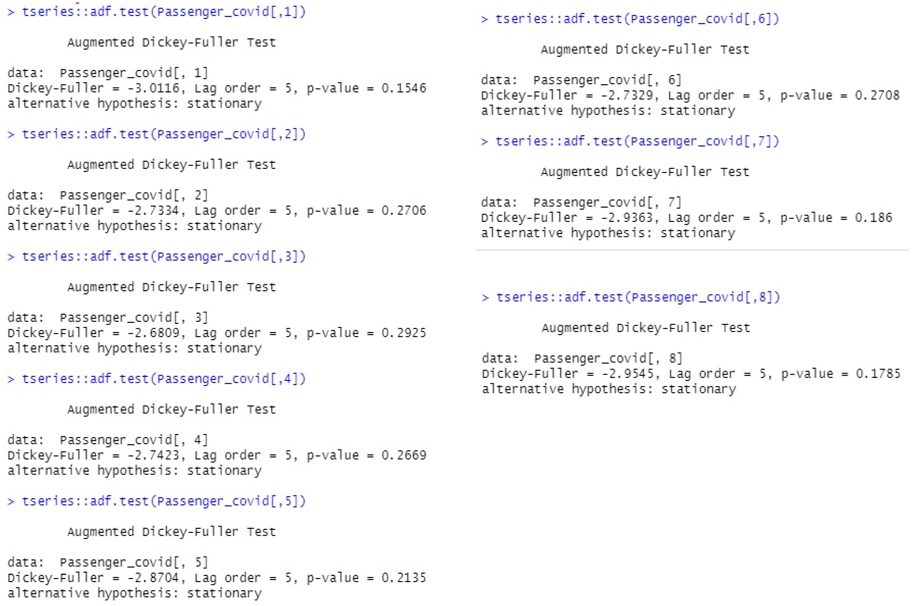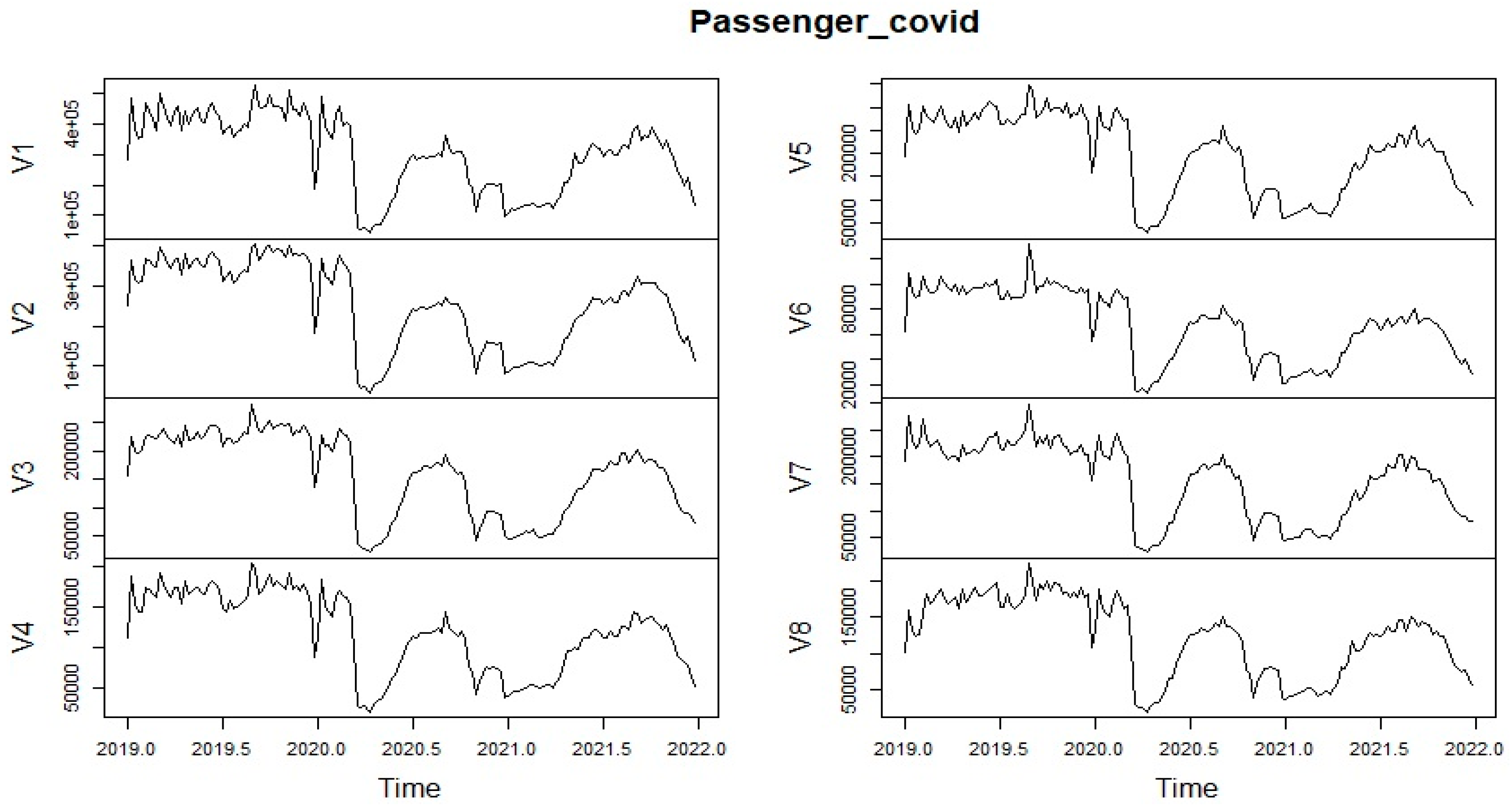 We worked with weekly data, which represent an appropriate compromise between detail and statistical stability. While daily data would provide higher resolution, they are characterized by substantial variability caused by seasonality and short-term fluctuations. Monthly data, on the other hand, would not allow us to capture passengers’ rapid responses to changing pandemic measures.