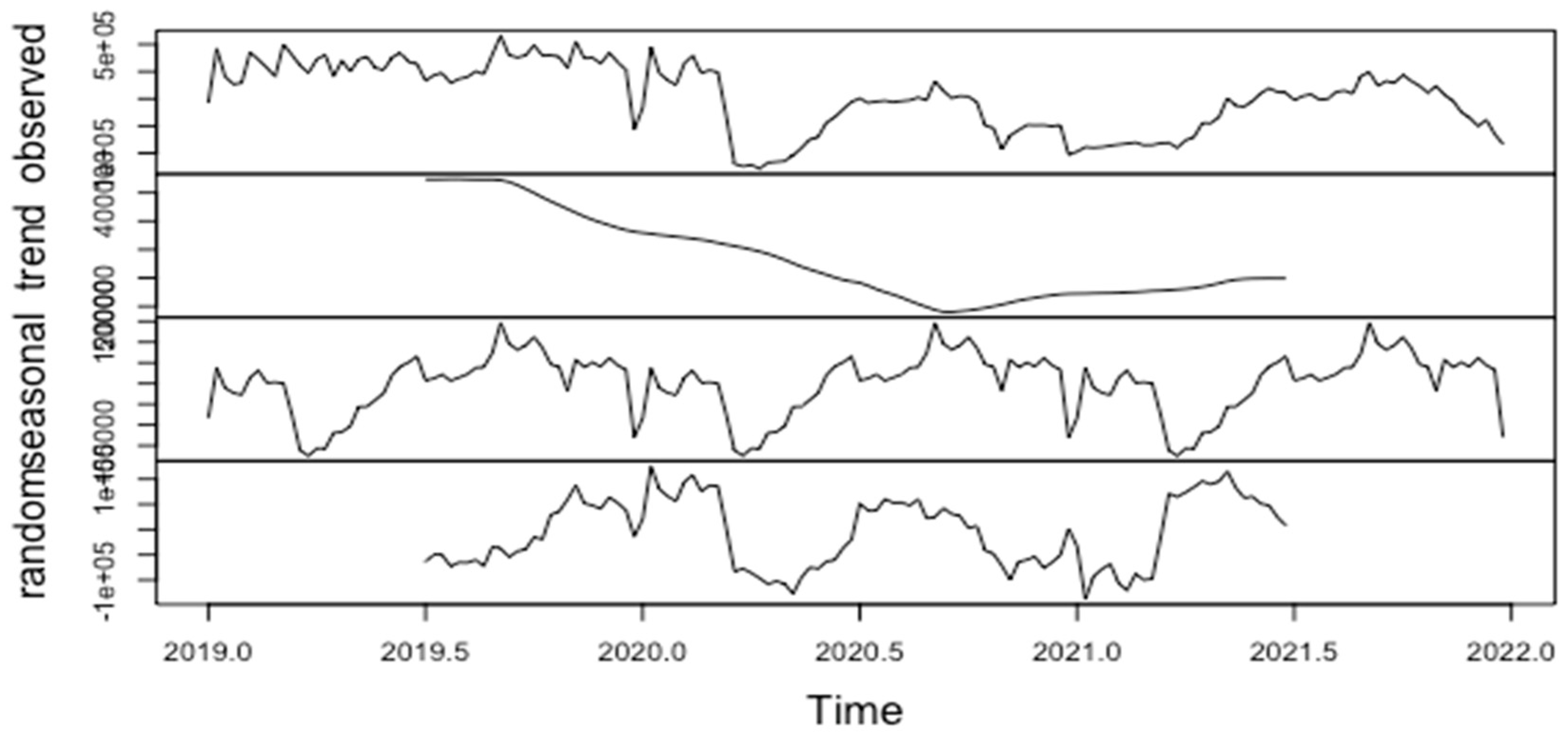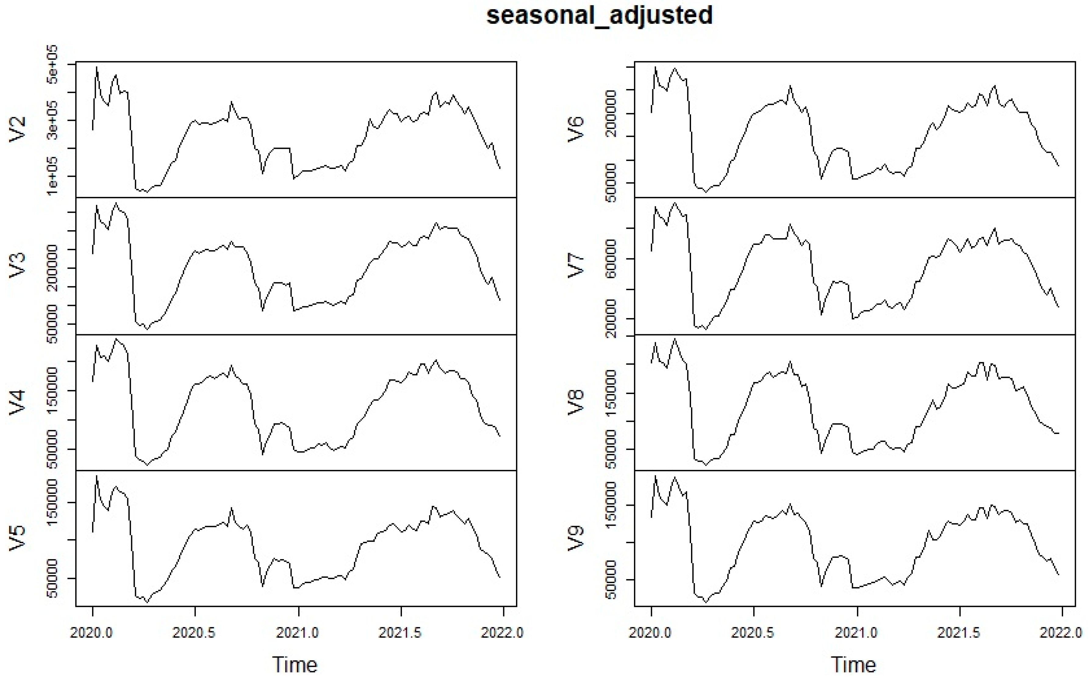 Due to the use of seasonally adjusted data, the forecast produced by the model covered a two-year period, using data from 2021 and 2022. By excluding the seasonal component, regularly recurring fluctuations (for example holidays, summer vacations) were eliminated, which increased the accuracy of the prediction. The modelled data across individual regions show a very similar development; the same applies to the individual measures, where deviations between the graphs are only minimal. Although the model was designed to allow region-level analysis, the empirical results confirm that regional differences in Slovakia during the pandemic were relatively minor. This can be attributed to the predominantly nationwide character of government restrictions in 2020 and the late introduction of regionally differentiated measures in 2021. Additionally, the strong centralization of the Slovak rail network along the Bratislava–Košice corridor reduces regional heterogeneity in travel patterns. Nevertheless, maintaining a regionally sensitive modelling framework is valuable, as it enables scenario testing and capacity planning for potential future events with stronger local impacts (district-level outbreaks or natural disruptions).