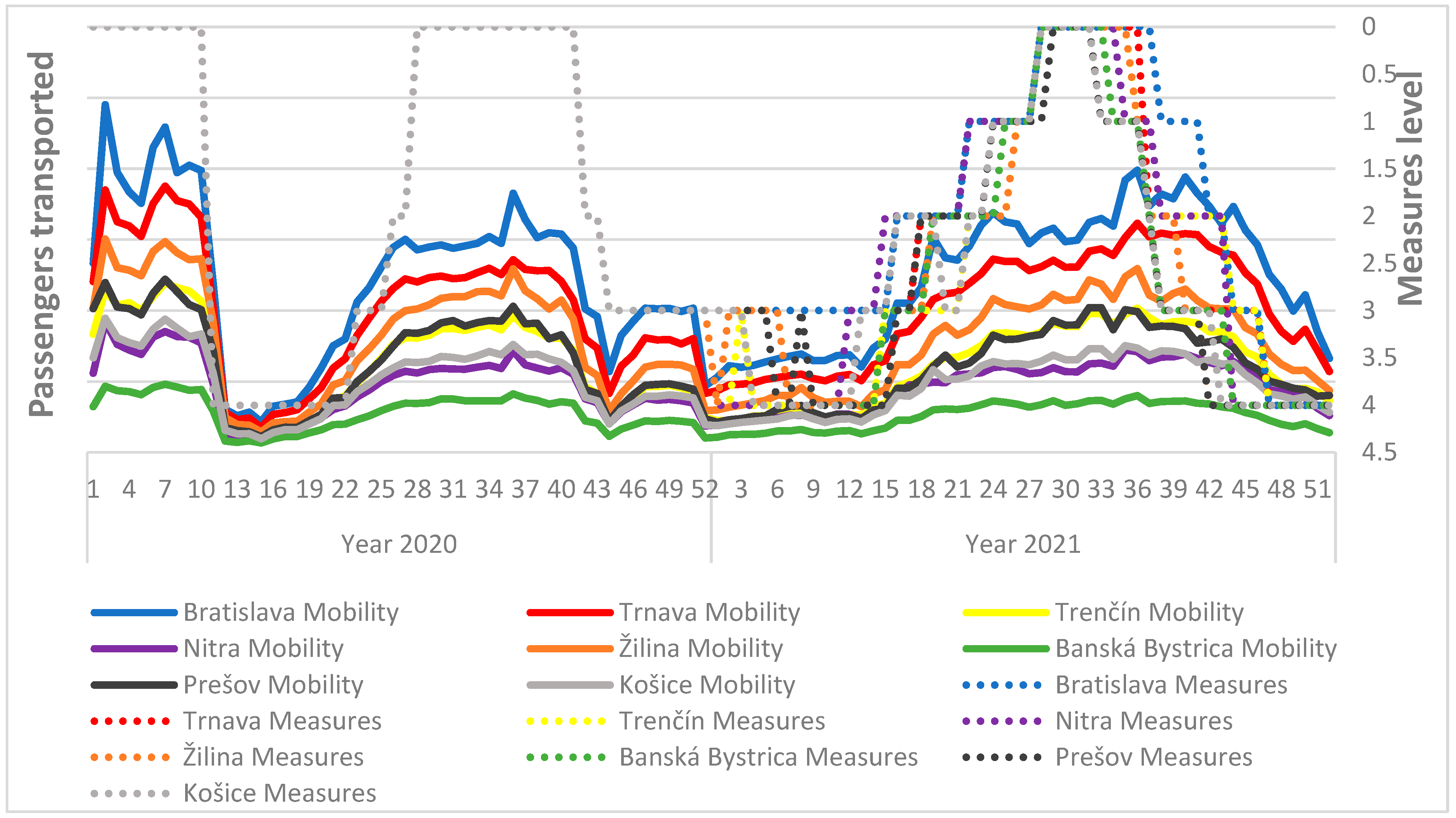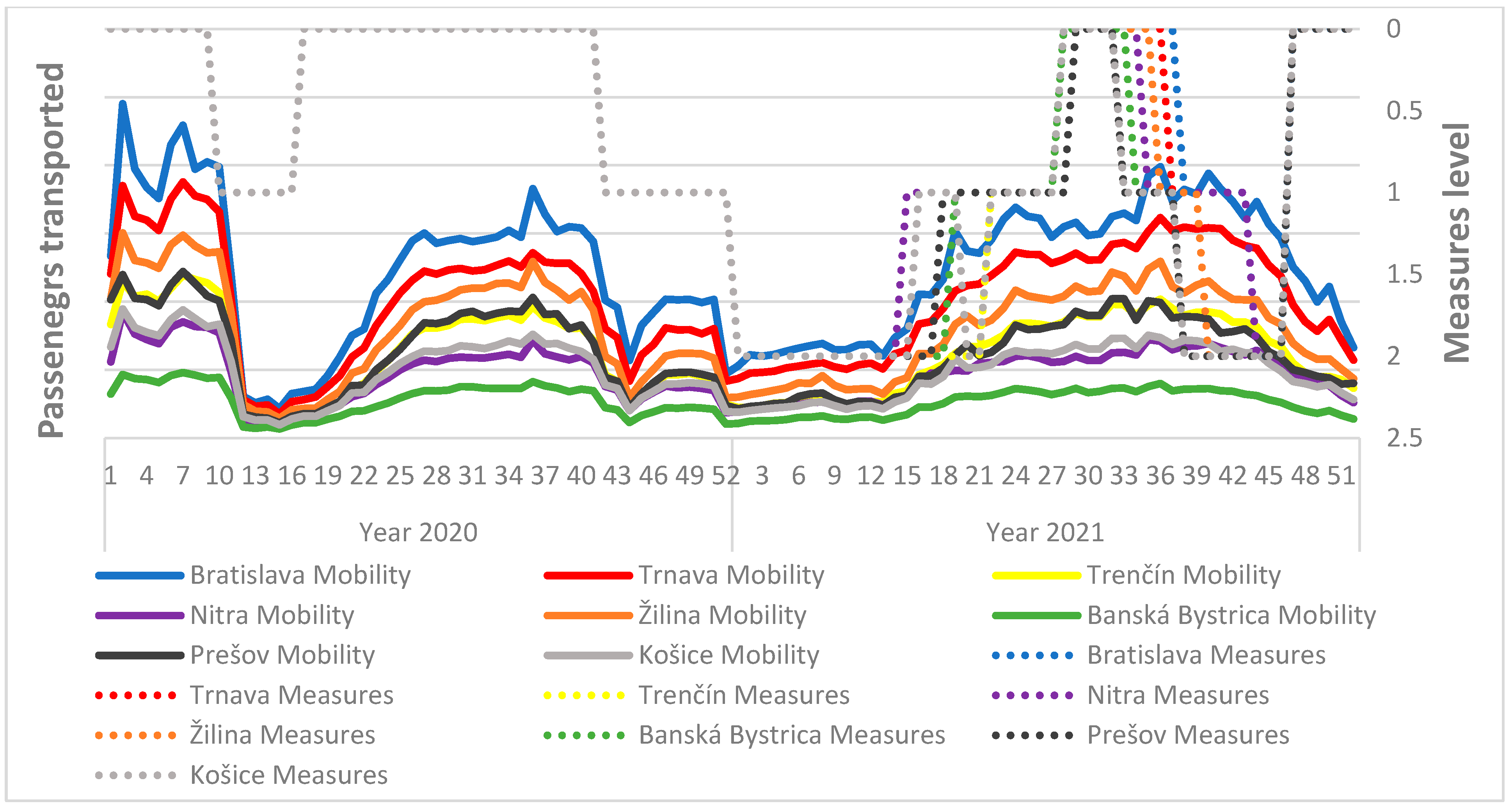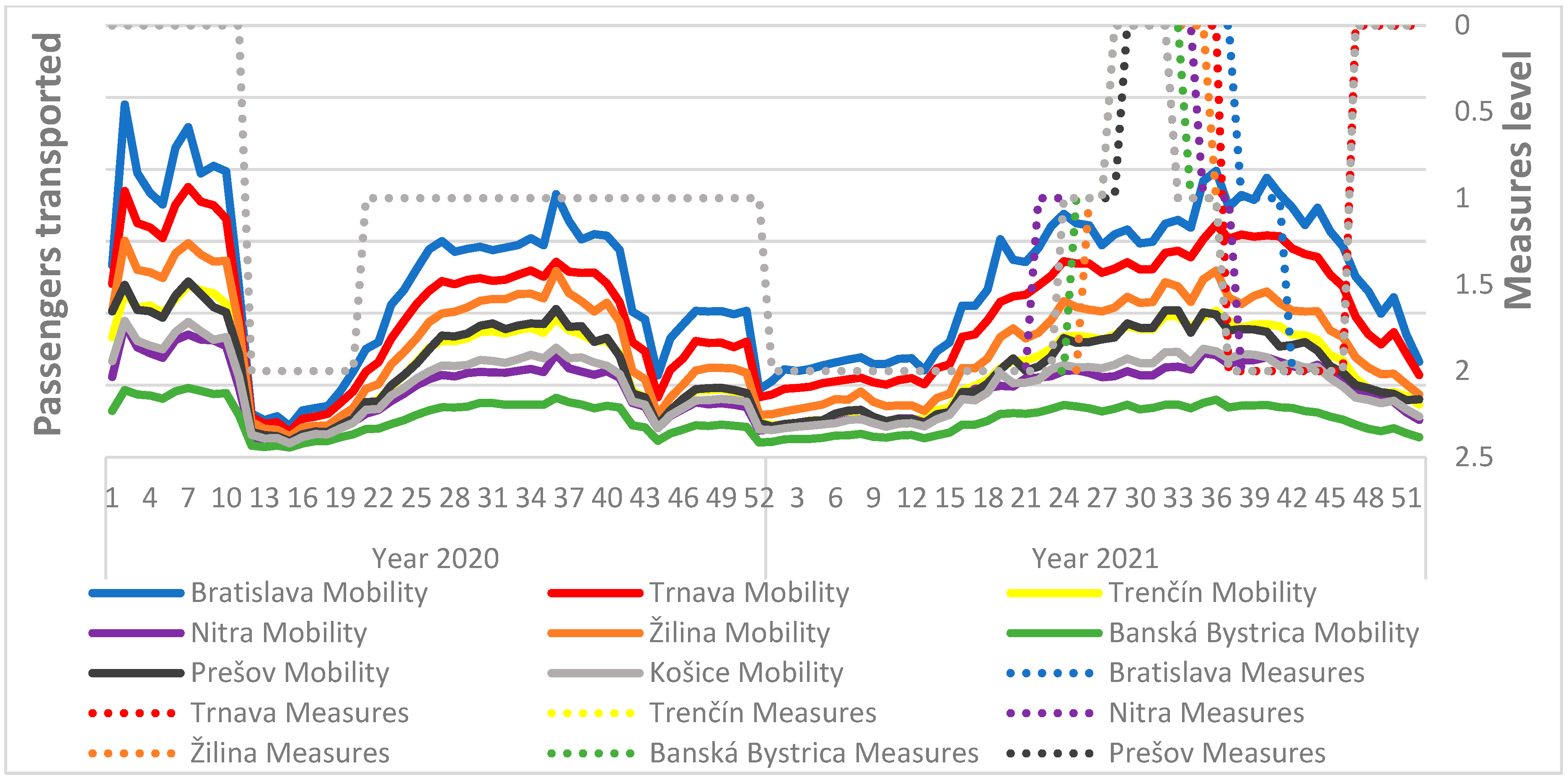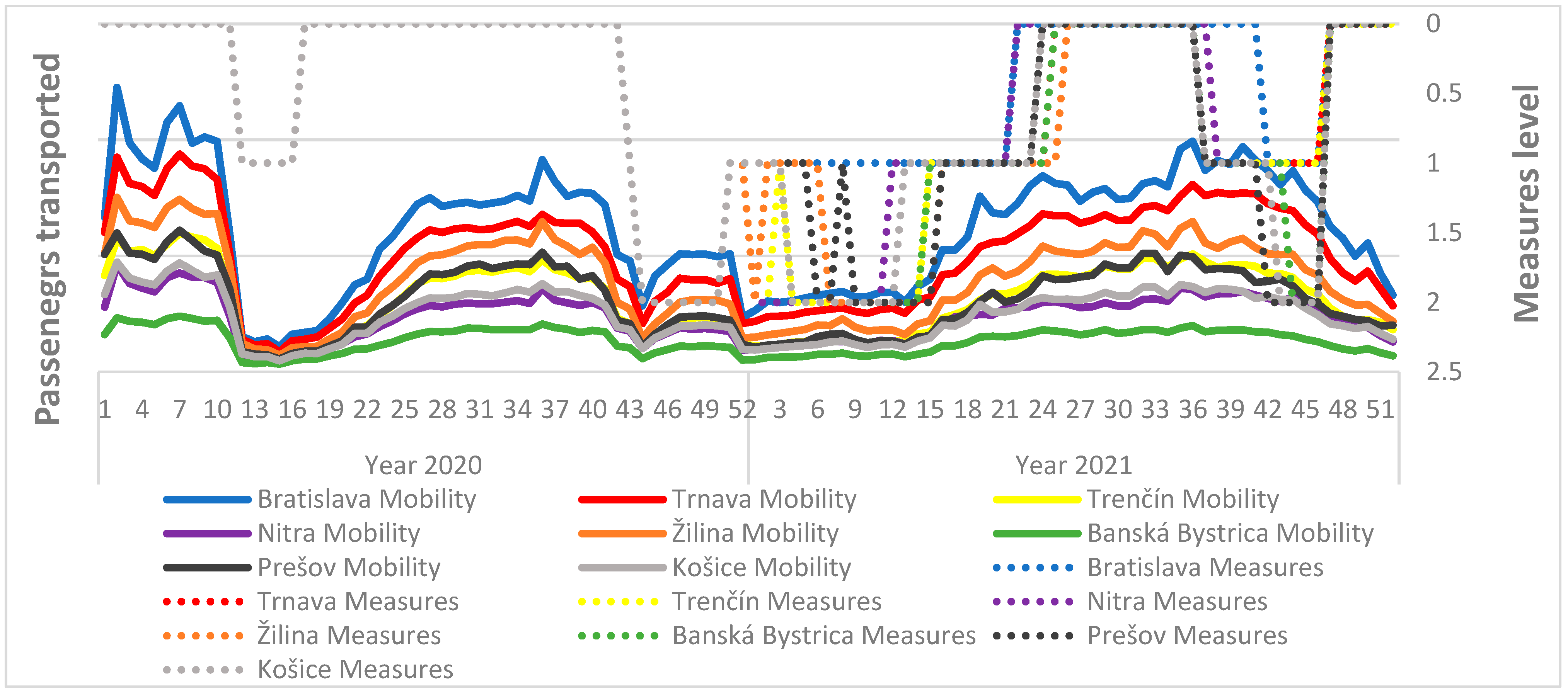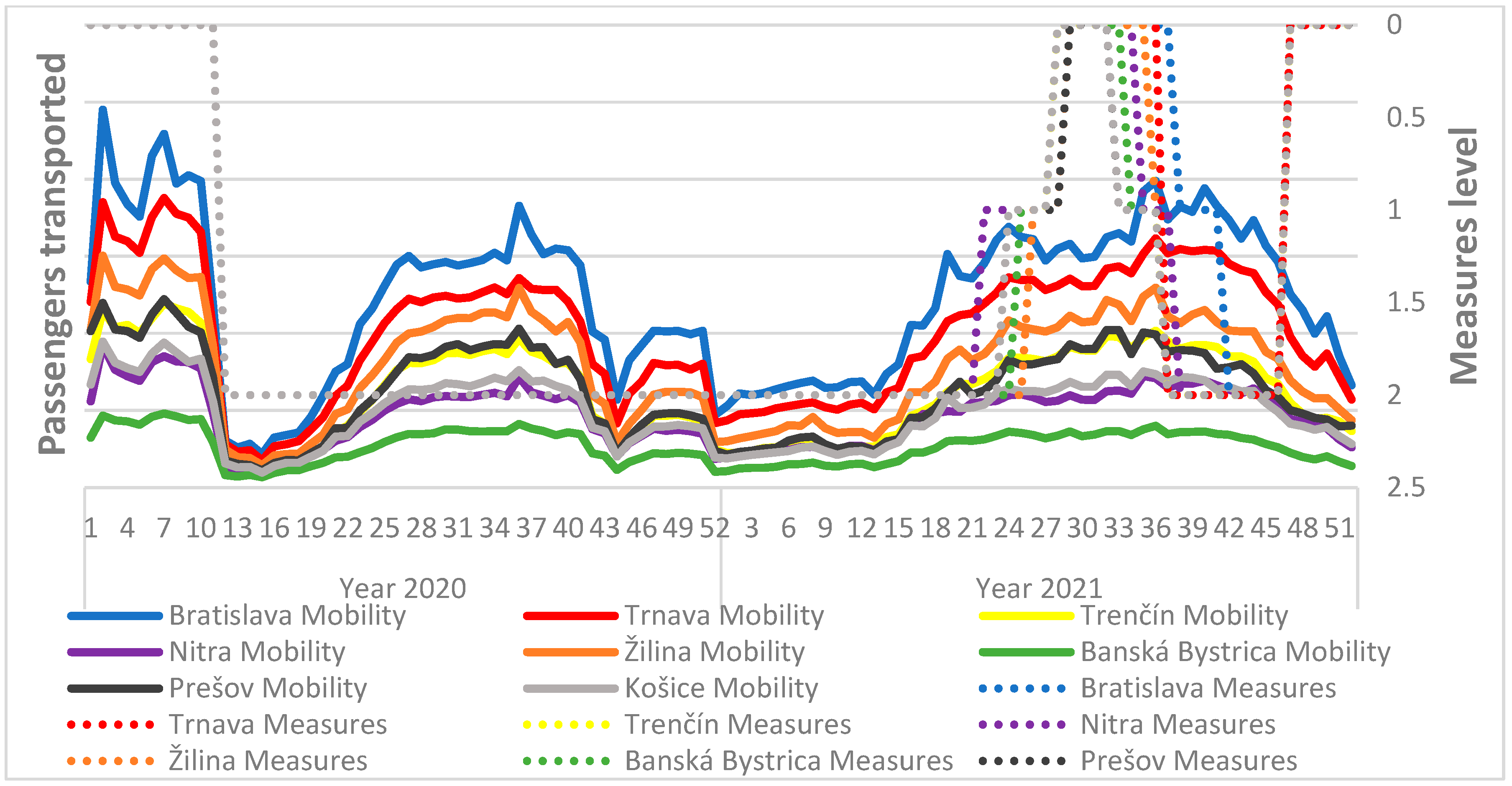 Figure 31 presents a comparison of passenger transport changes in relation to the level of restrictions introduced for the limitation of movement in the Bratislava region.