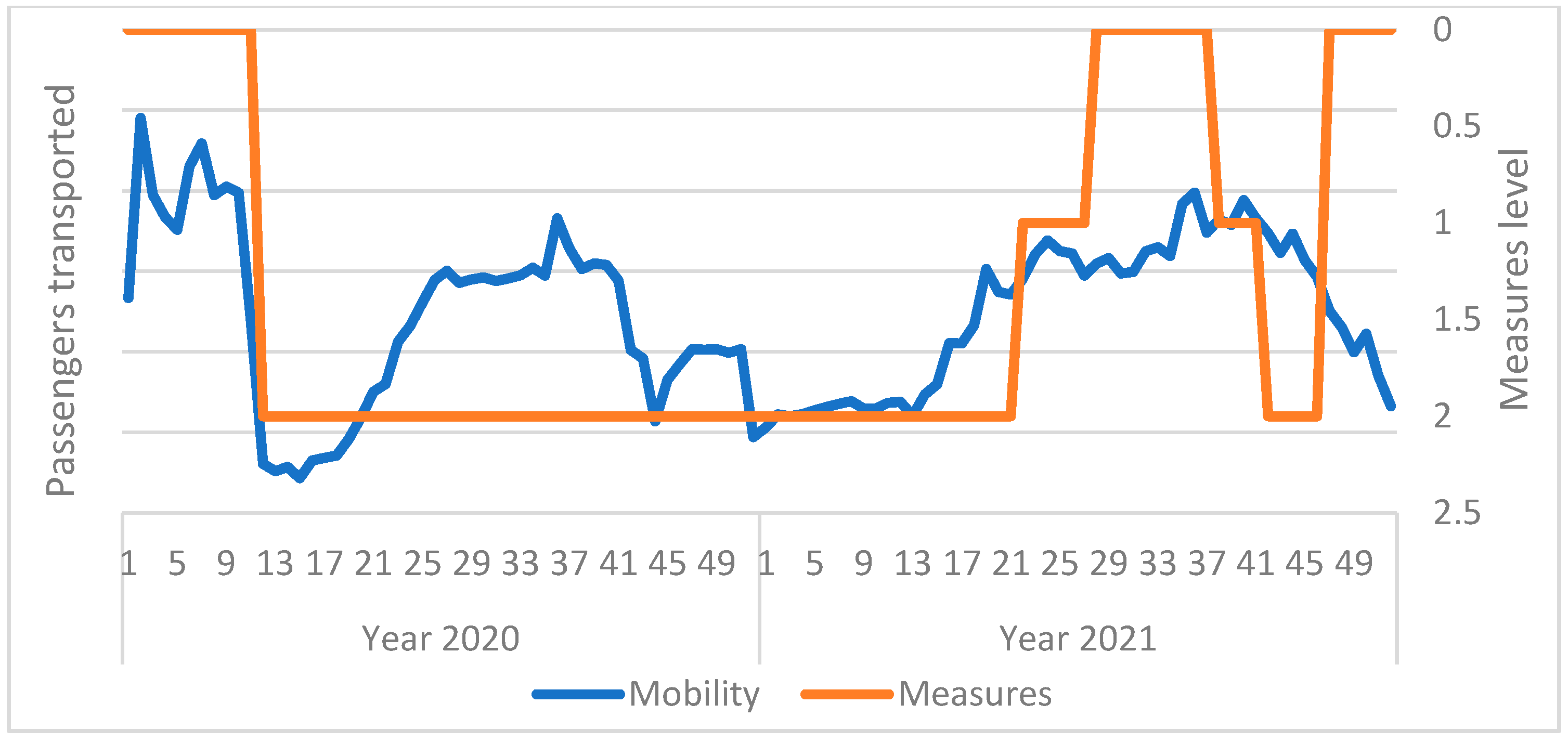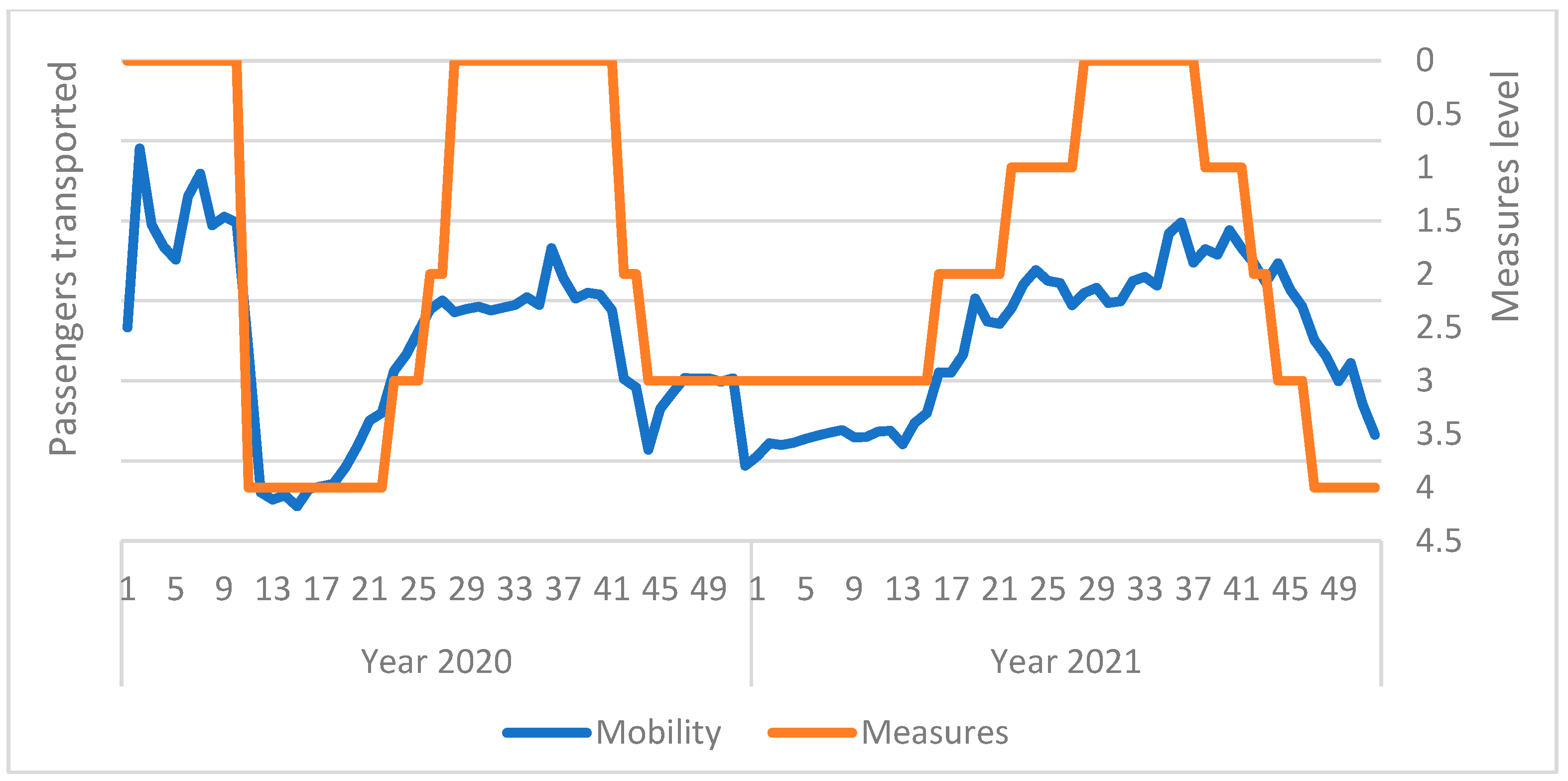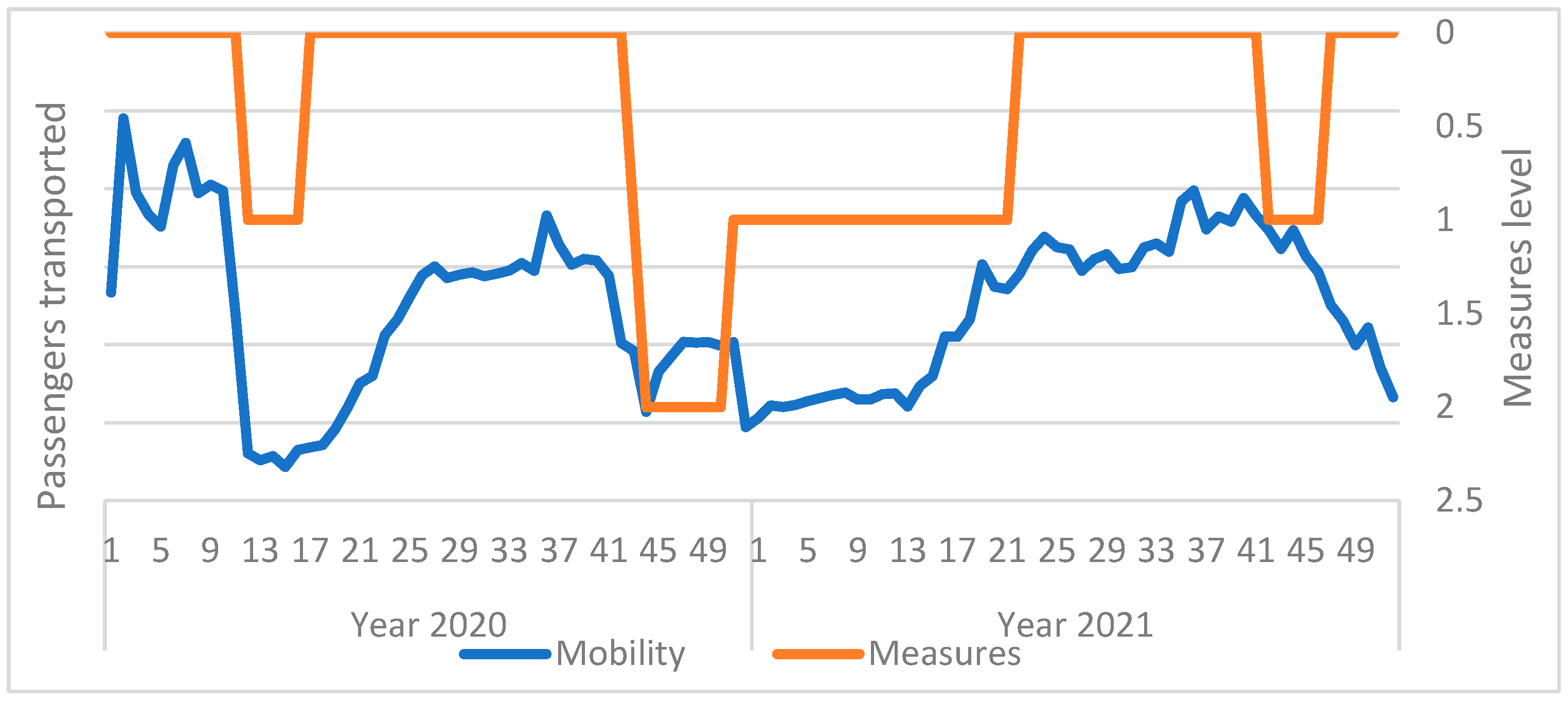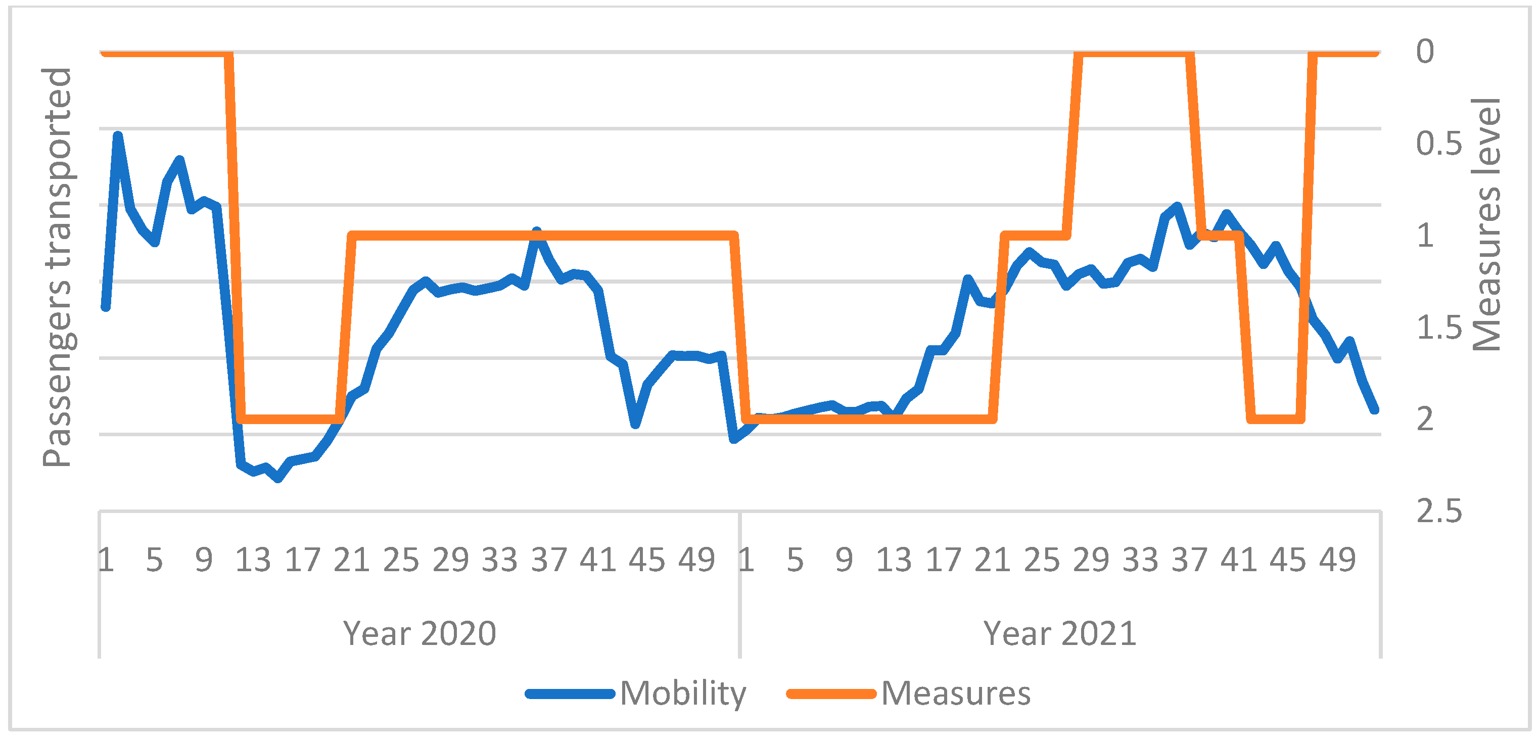 Since the model was built using a binary variable, when proposing concrete measures (reduction of realized performance in train kilometres), we carried out a comparison of the number of passengers transported before and during the COVID-19 pandemic. Passenger transport in individual weeks of 2019 was taken as the baseline for comparison with 2020 and 2021. Such a comparison is justified, as the developed and validated model confirmed the existence of a correlation between the levels of restrictions in different areas and the number of passengers transported in rail transport.