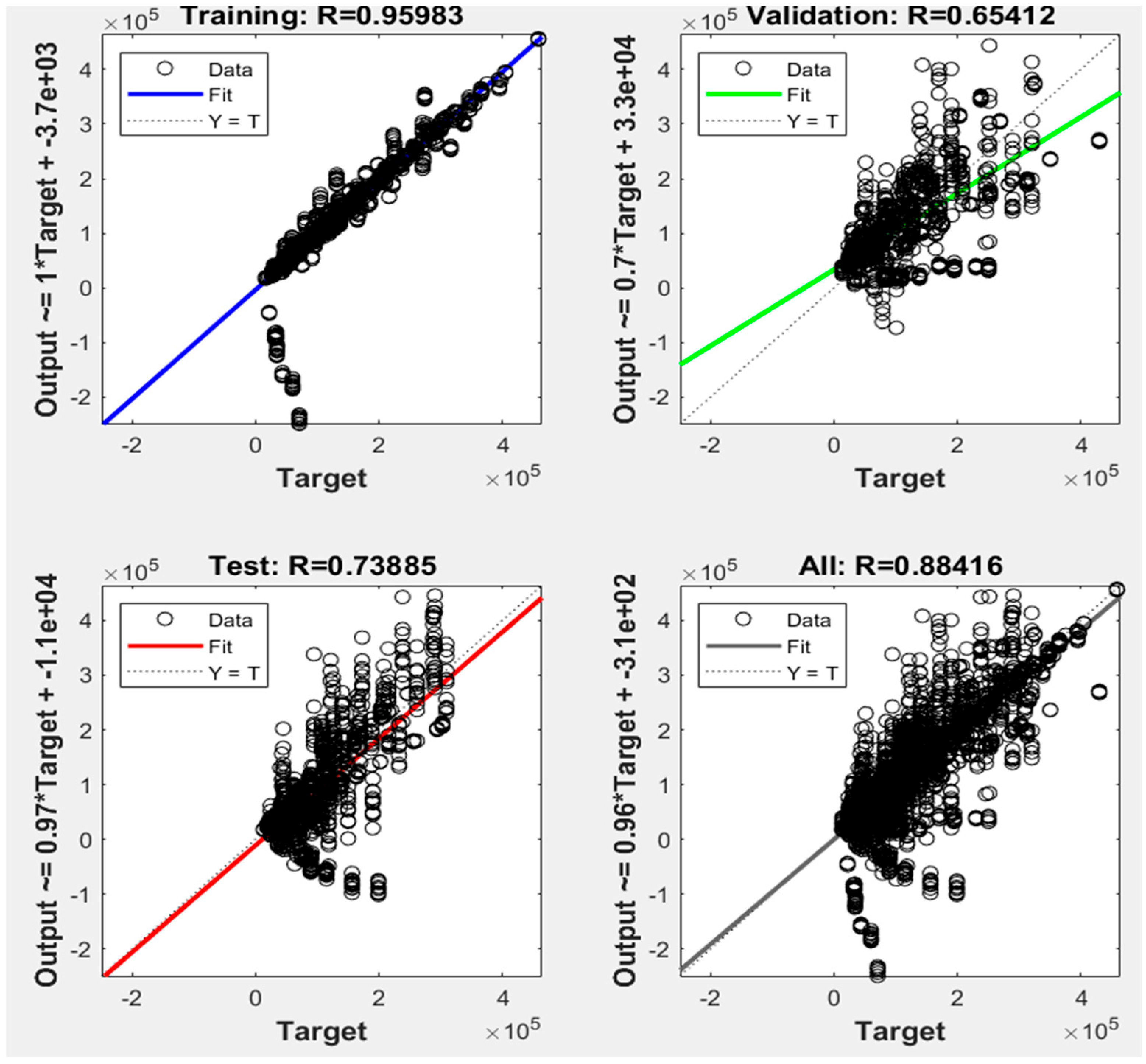 The results confirm the existence of regression for the training, validation, and testing phases, thereby demonstrating that the model adequately captured the relationship between the applied measures and passenger mobility.