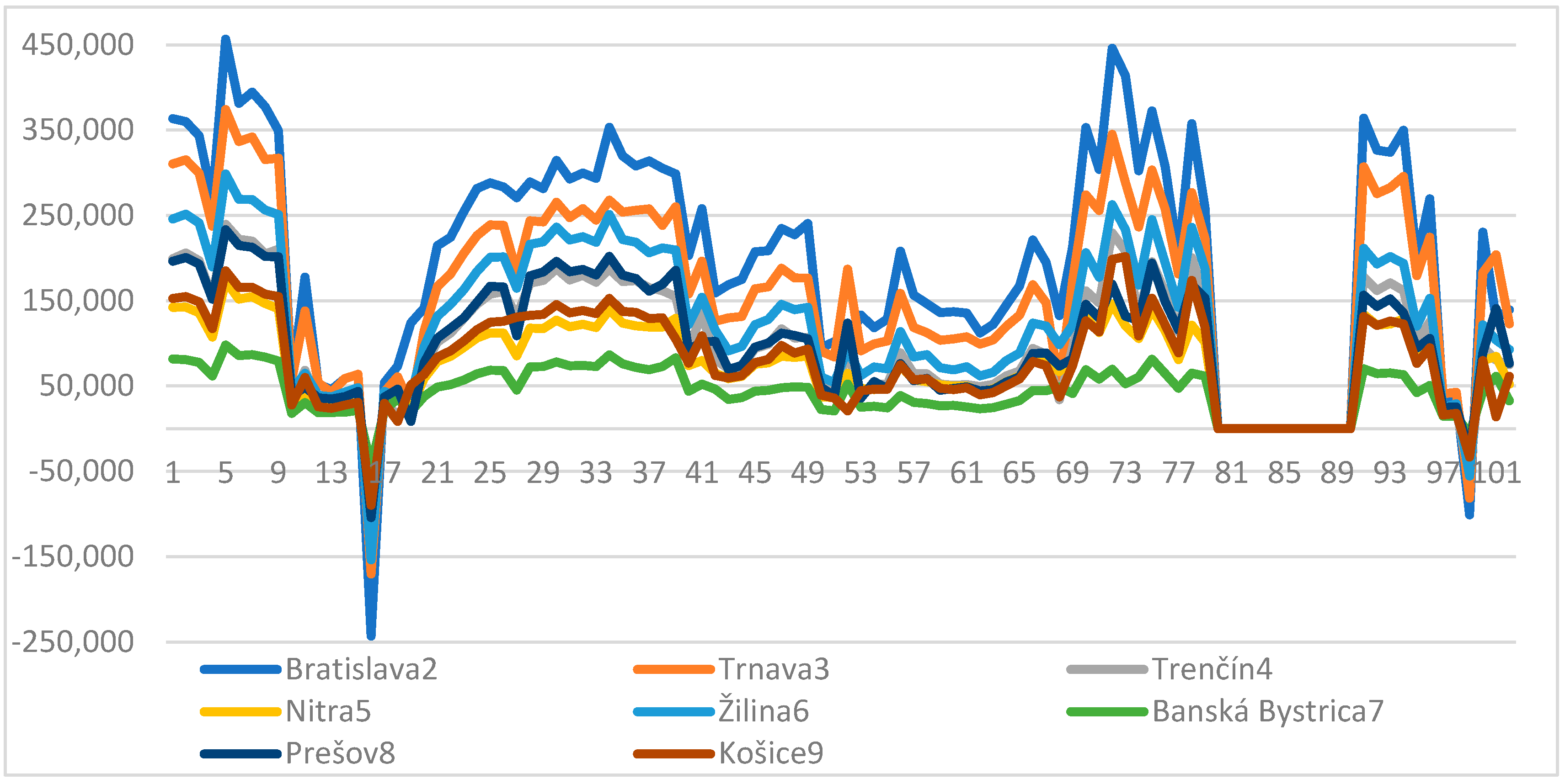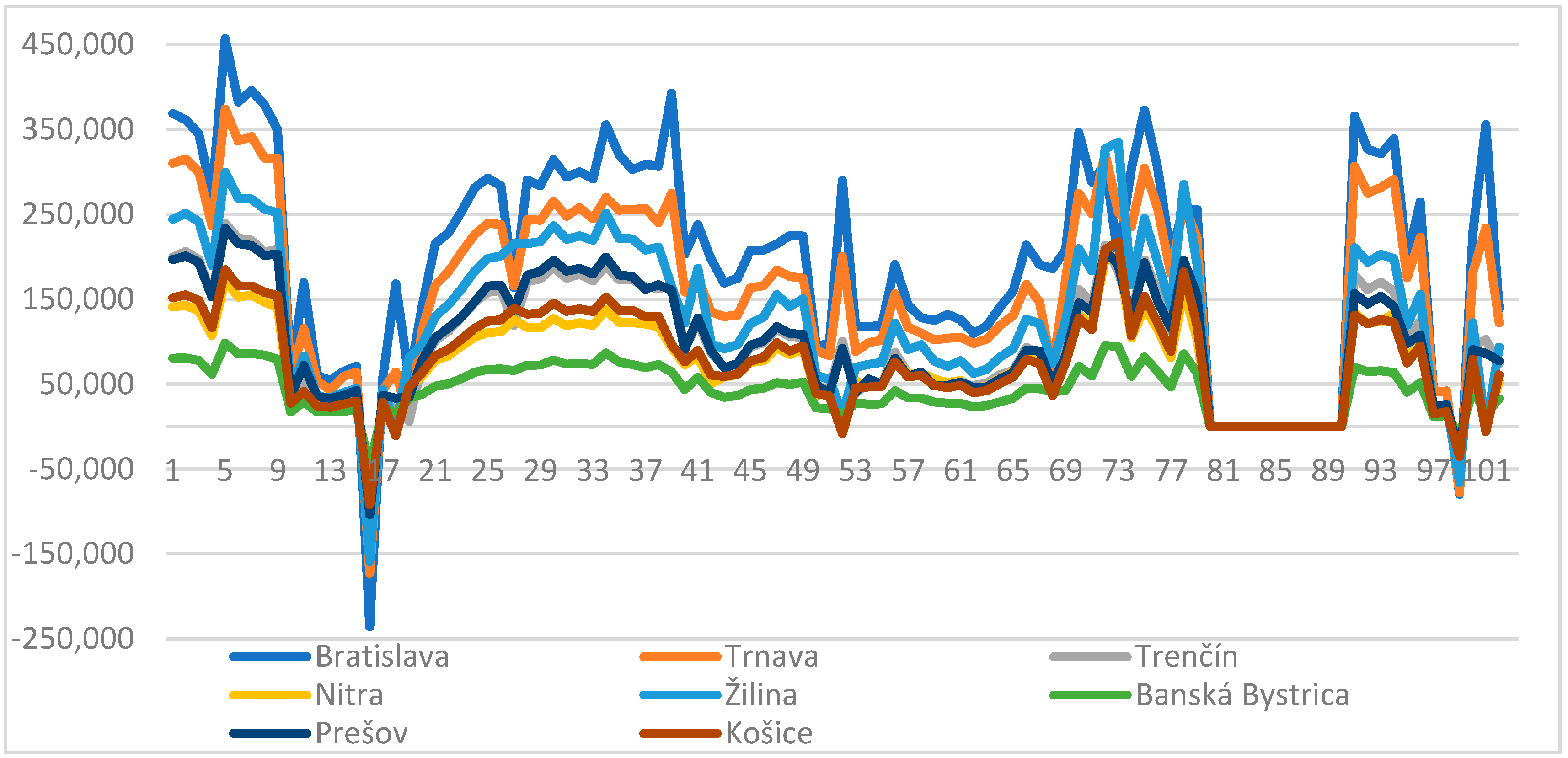 The data were processed in weekly intervals for all regions of Slovakia. Sources included the Epidemiological Information System (EPIS) and records from the Public Health Authority of the Slovak Republic, which provided continuous updates on the development of the pandemic situation at the district level [