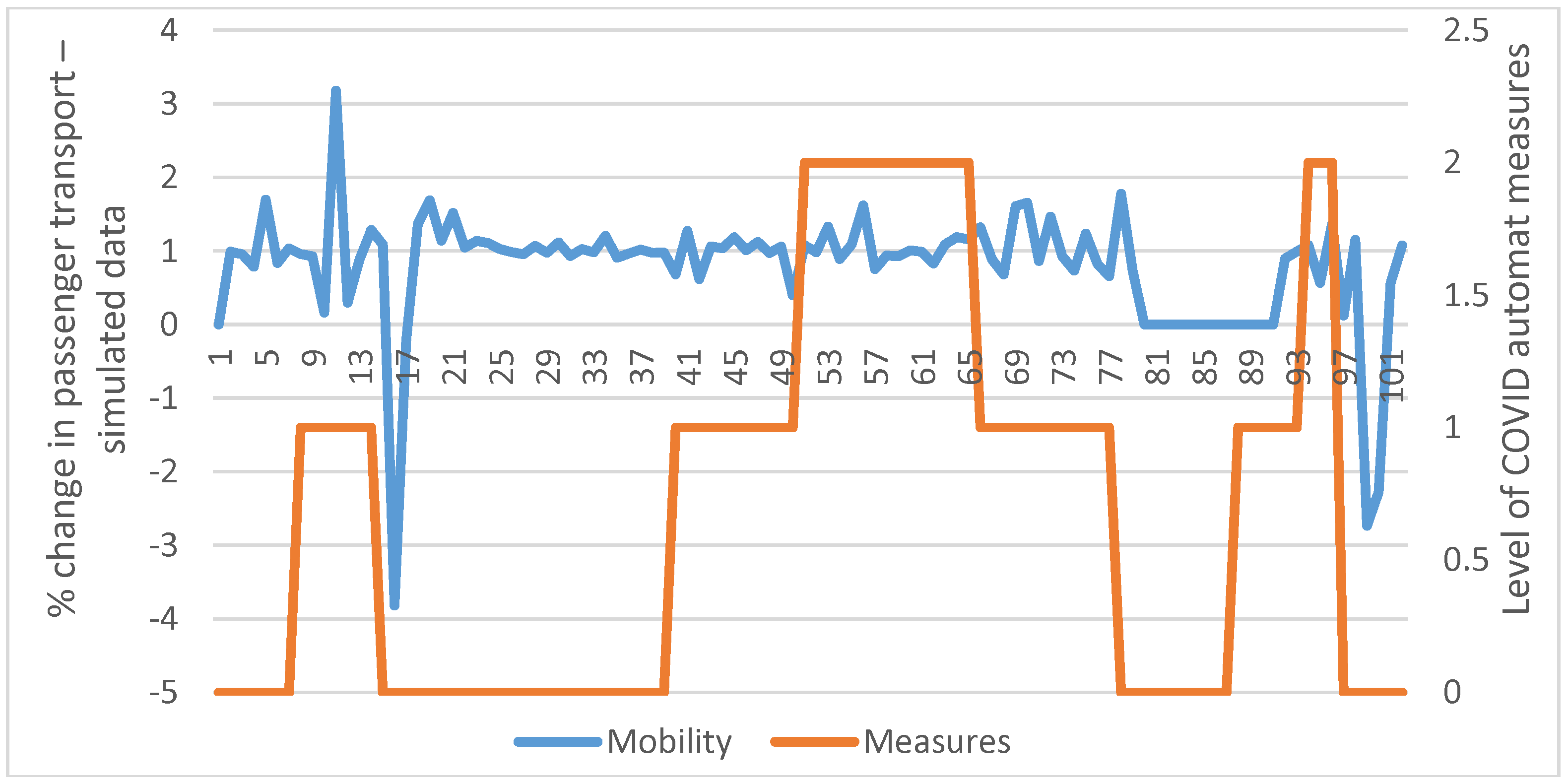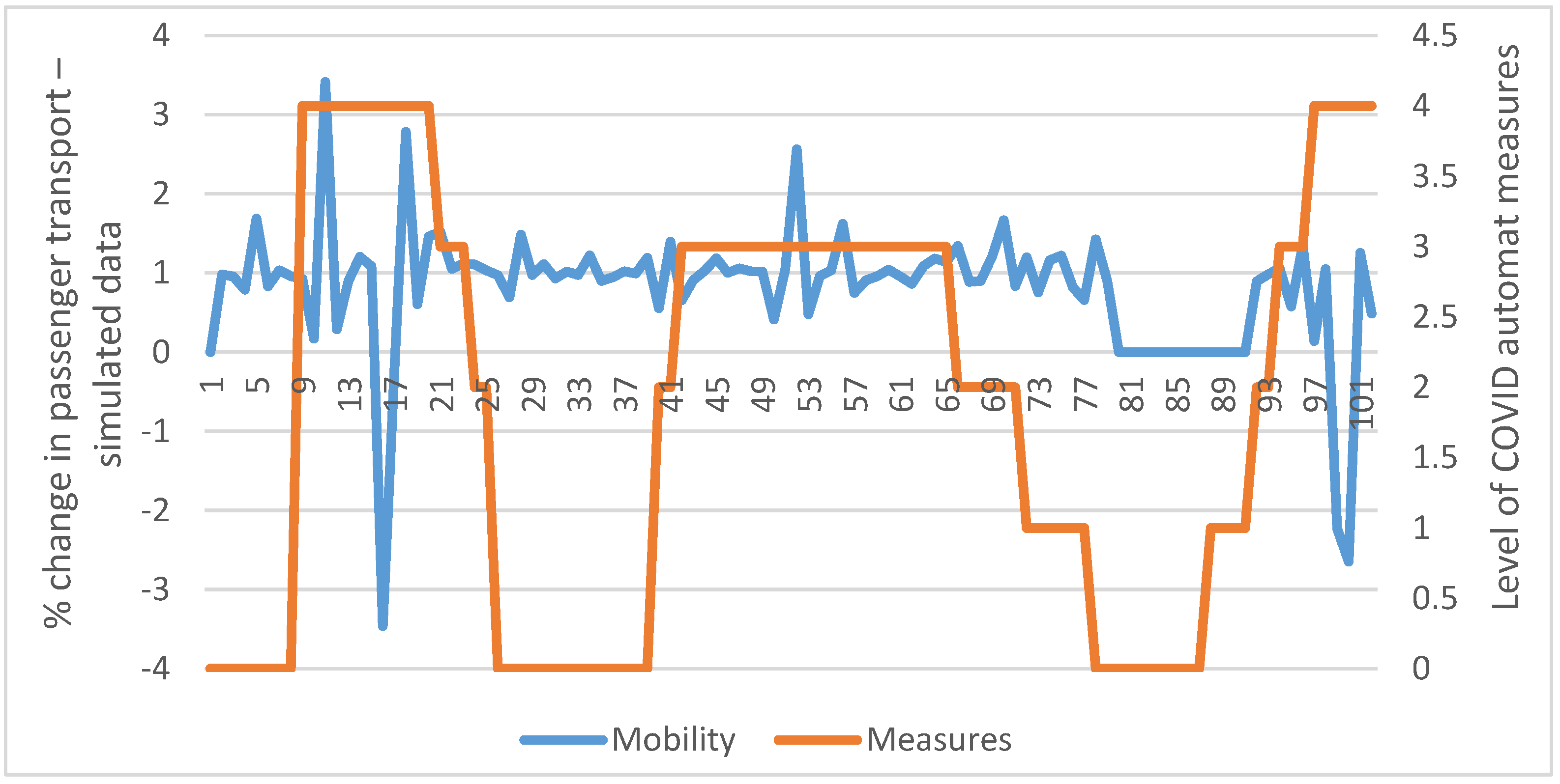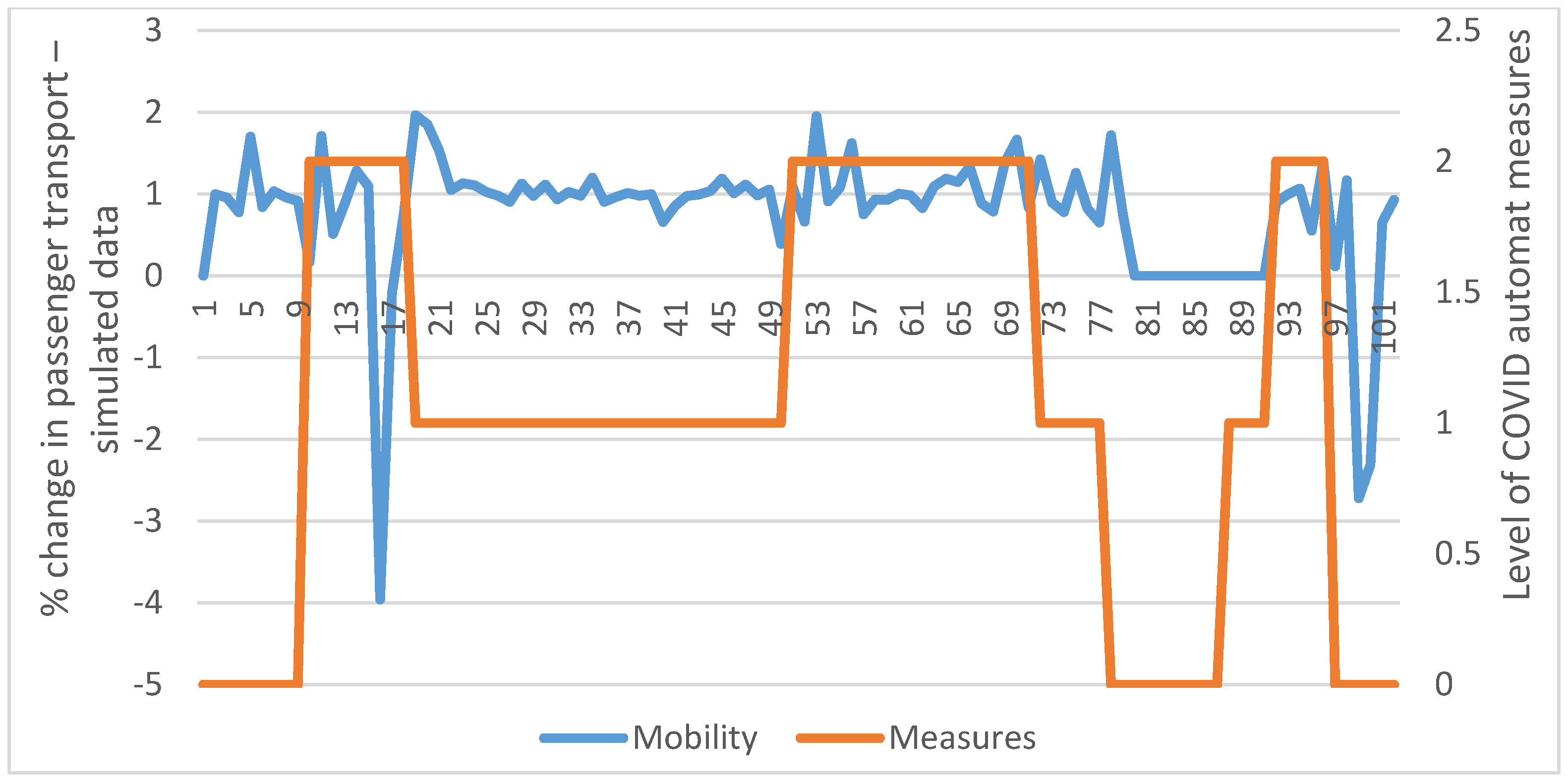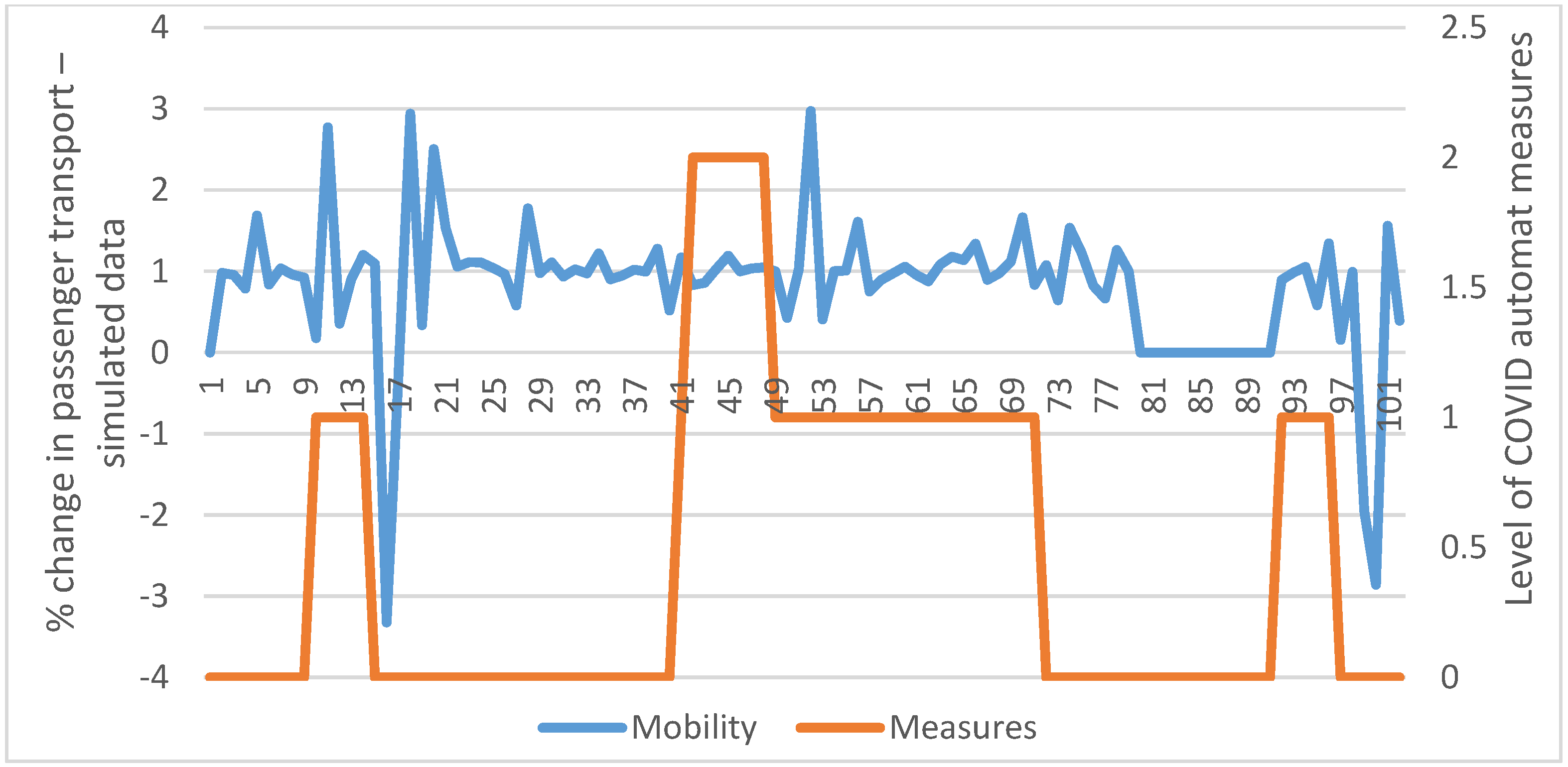 Nevertheless, the study has certain limitations. First, the model was built on binomial variables representing the tightening or relaxation of measures, which cannot fully capture the heterogeneity and complexity of real-world restrictions. Second, the analysis relied on aggregated weekly data, which may conceal short-term fluctuations in mobility. Third, the regional focus on Bratislava, while justified by its role as the country’s most important commuting hub, constrains the generalizability of the findings to regions with different mobility structures.