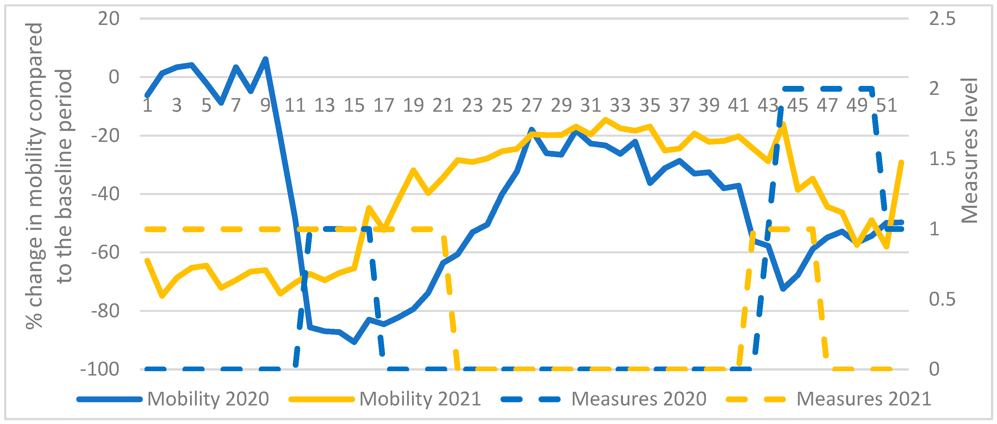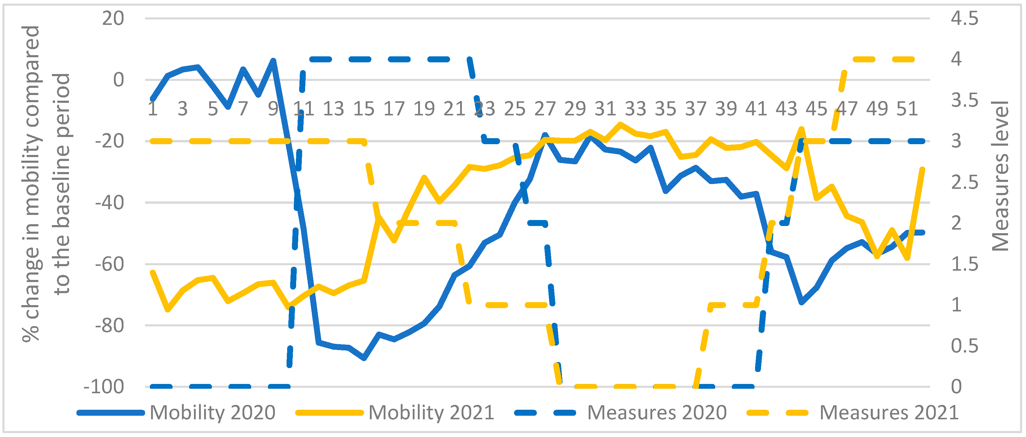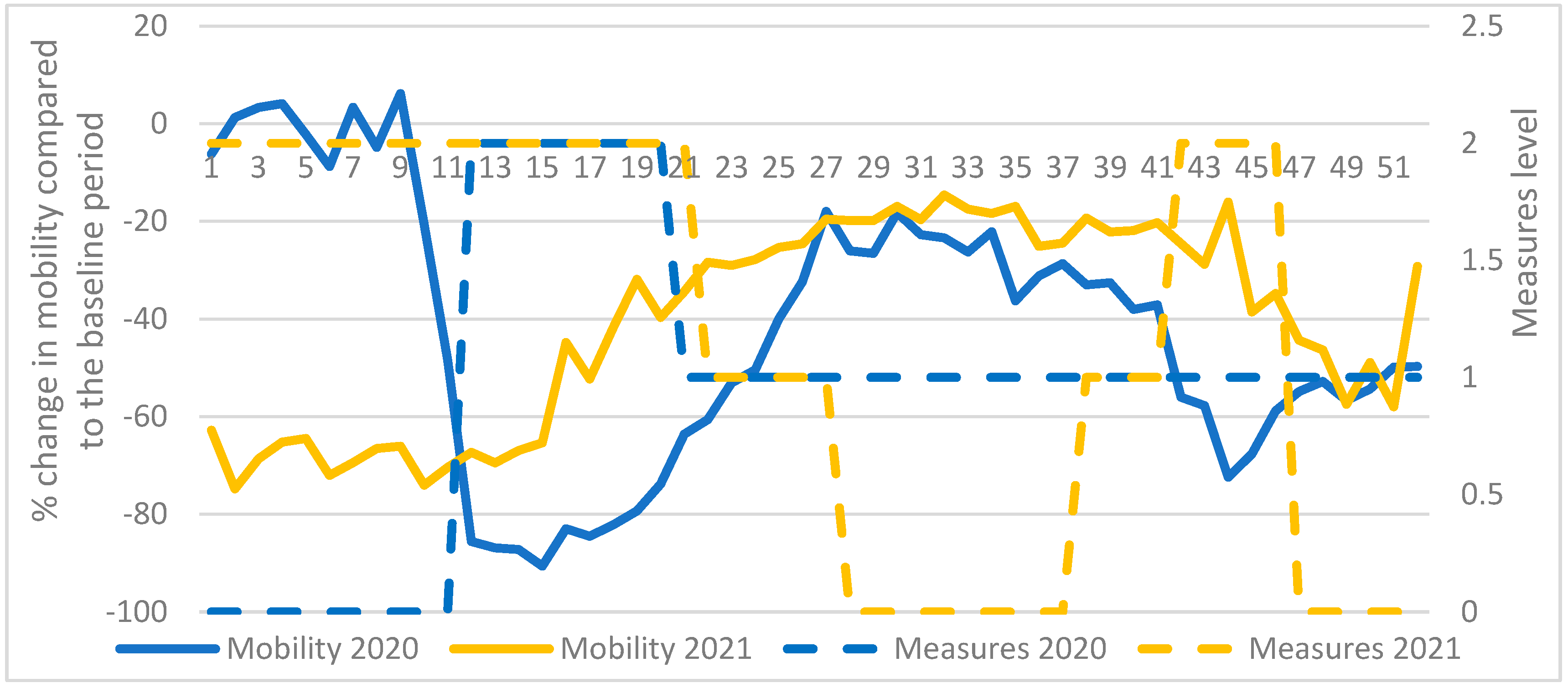 Although measures in 2021 were introduced at the regional level according to the evolving epidemiological situation, the same level of restrictions generally led to comparable percentage changes in the number of transported passengers across different regions.