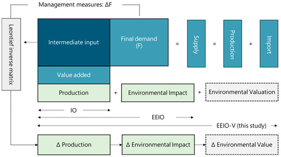 Conventional EEIO models are characterized by their ability to quantify the environmental impacts associated with economic activities. In contrast, the EEIO-V model developed in this study advances the conventional framework by incorporating the monetization of environmental impacts. This enhancement enables the evaluation of policy or management measures from a cost–benefit perspective, facilitating integration into decision-making processes [31]. The conceptual structure of the EEIO-V model can be represented as (7):