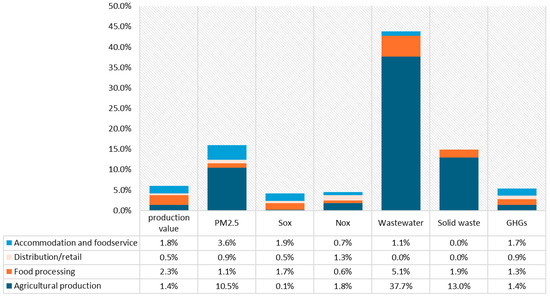 Based on the EEIO-V model estimations, Taiwan’s total economic output in 2021 across the 63-sector input–output framework reached approximately USD 1.62 trillion. Among these, sectors associated with the four stages of the FSC—agricultural production, food processing, distribution/retail, and foodservice—accounted for roughly USD 97.56 billion, representing 6% of total output. However, the environmental impacts attributable to the FSC were disproportionately high. For instance, food-related activities accounted for 16% of total PM2.5 emissions, 43.9% of wastewater discharge, and 5.4% of greenhouse gas (GHG) emissions, all exceeding their economic share.