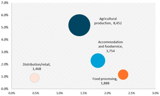 This study synthesizes and adapts classifications of the FSC stages based on prior literature [10,40,41,42,43,44,45]. We categorize the national FSC into four stages: (1) agricultural production, (2) food processing, (3) distribution/retail, and (4) accommodation and foodservice.
