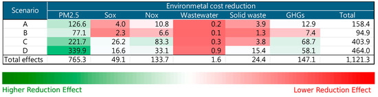 Based on the aforementioned parameters and the BPT methodology, the unit damage costs (BPT) for PM2.5, SOx, and NOx in 2021 monetary values were estimated at 2.19 million USD/t, 0.31 million USD/t, and 0.11 million USD/t, respectively.