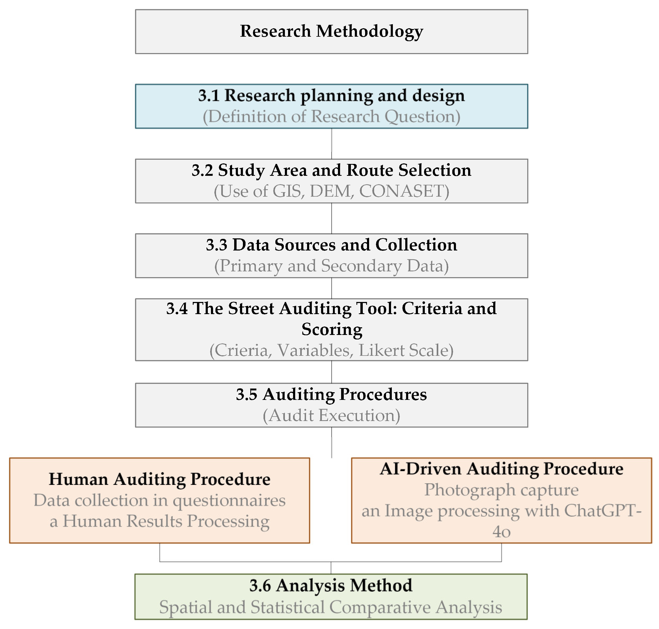 Section 3 (materials and methods) focuses on describing the research planning and design, the audit tool applied, the human street audit procedure, AI-driven auditing methods, and the analysis methods.