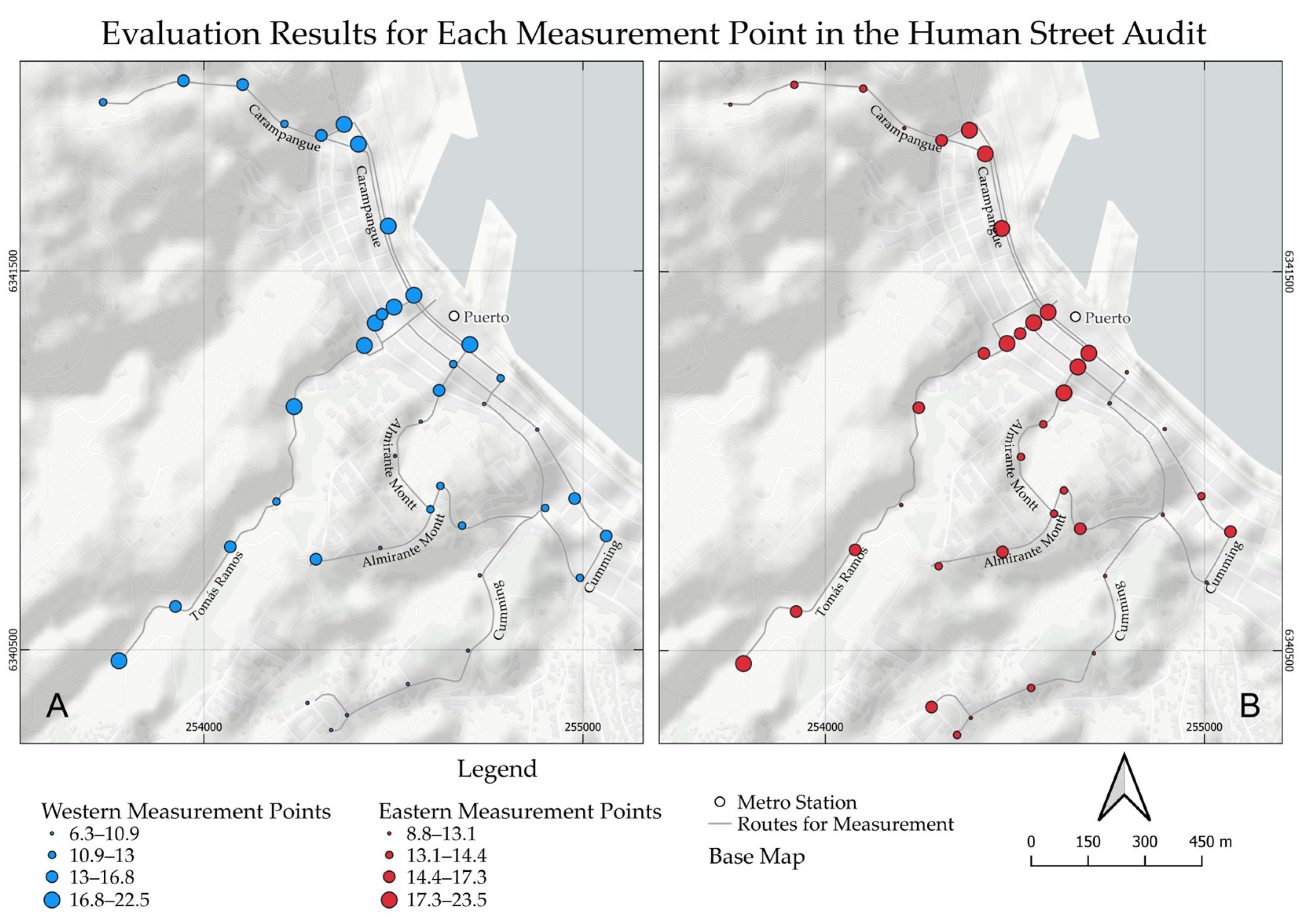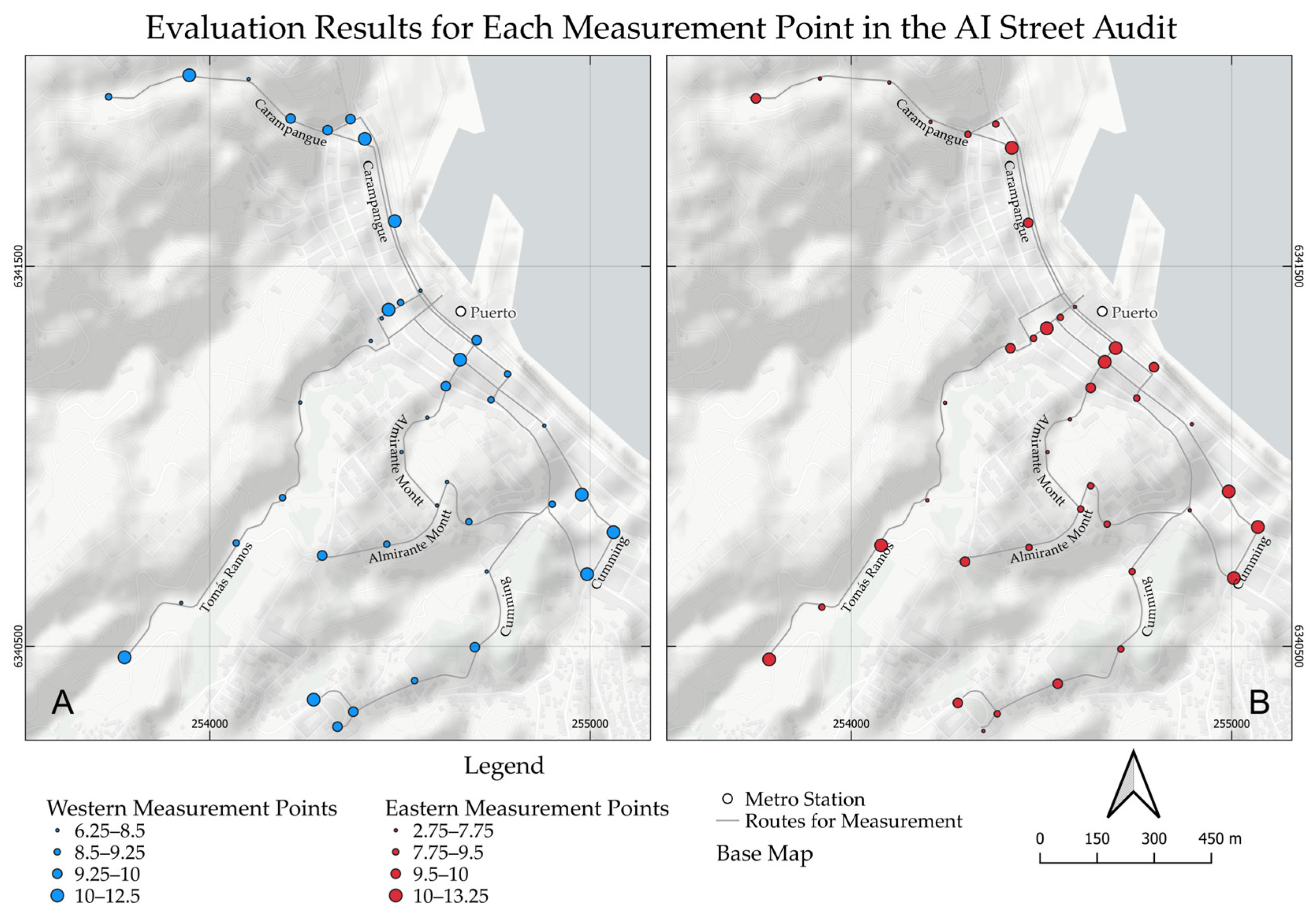 Regarding the objective, within the context of promoting E-Bike use in the city of Valparaíso and exploring local scale assessment, this study seeks to compare the results of human and AI-driven street auditing methods directed at identifying adequate routes for E-Bikes in the city that connect the metro station Puerto to Alemania Avenue, a key street that connects different hills of Valparaíso. In addition, through AI-driven auditing methods, this research expands the audited streets to other potential routes connecting other metro stations of the city to Alemania Avenue. In terms of the research gap, by comparing human and AI-driven auditing, there may be the possibility of reducing subjectivity delivered by human evaluation, as mentioned by Grabow et al. [