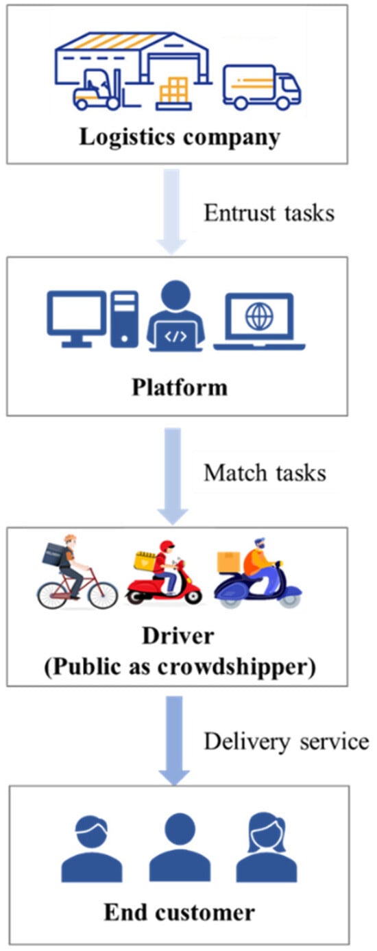 Unlike traditional distribution, the crowdsourcing model does not rely on hired professional drivers but instead uses platforms to match delivery tasks with voluntary public participants (i.e., crowdshippers). These participants are not salaried employees but independent delivery service providers, characterized by self-selected tasks, flexible hours, personal equipment, and pay-per-order arrangements [,].