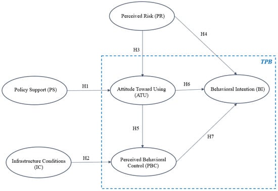 This study focuses on the Korean public and constructs an extended TPB model. Key external variables, including perceived risk (PR), policy support (PS), and infrastructure conditions (IC), are incorporated into the analysis. The objective is to examine how these factors influence the public’s willingness to participate as crowdfunding users and to use cargo bikes. Based on this framework, the study proposes the following three specific research questions (RQs):