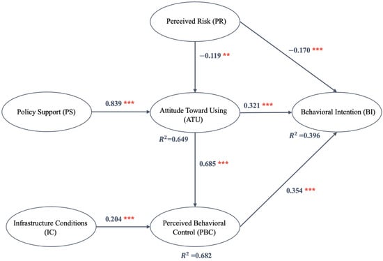 Under the consideration of the adoption characteristics of green transportation tools in crowdsourced delivery, key external variables such as PS, IC, and PR are introduced into the TPB model. There are several reasons for the proposal hypotheses. First, the institutional environment is an important external prerequisite for public adoption behavior. Existing studies have also pointed out that policy guidance has a positive impact on the public’s green travel decisions [,]. In the context of crowdsourced delivery, clear regulatory support, tax incentives, and transportation priority policies may enhance the public’s positive attitude towards green crowdsourced delivery.