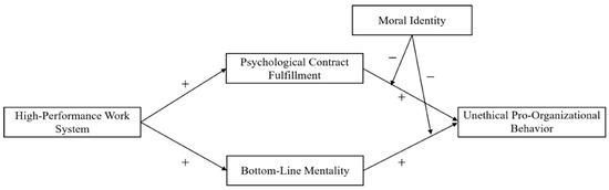 In summary, integrating a systems perspective with the dual-pathway logic of the JD-R model, this study proposes a moderated mediation framework (Figure 1) in which HPWSs serve as the independent variable, UPB as the dependent variable, psychological contract fulfillment and bottom-line mentality as parallel mediators, and moral identity as the moderating variable.