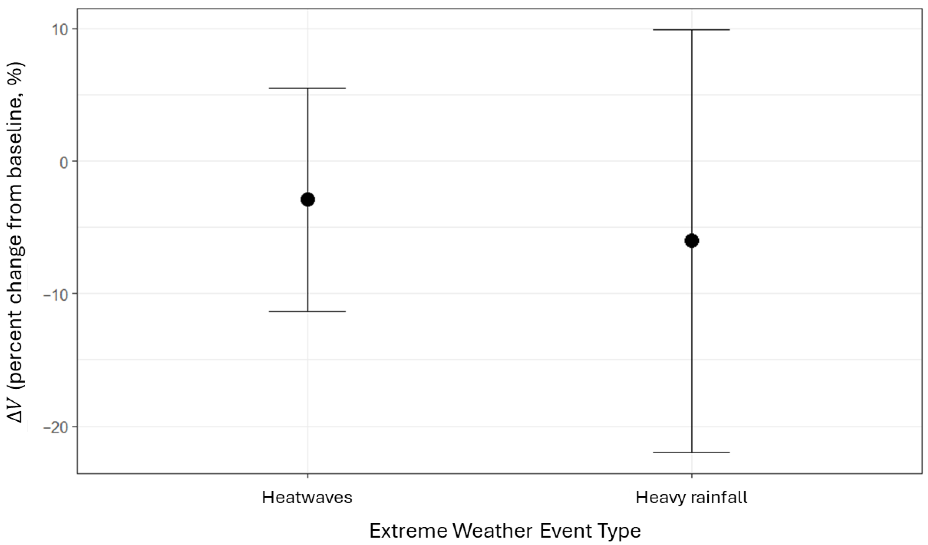 During heatwaves, service sustainment remained near baseline levels, with an average of 97.1% (95% CI: 88.6–105.5). Heavy rainfall events showed a similar pattern, with an average of 94.0% (95% CI: 78.1–109.9). These results indicate that overall throughput was largely preserved even under adverse weather conditions.