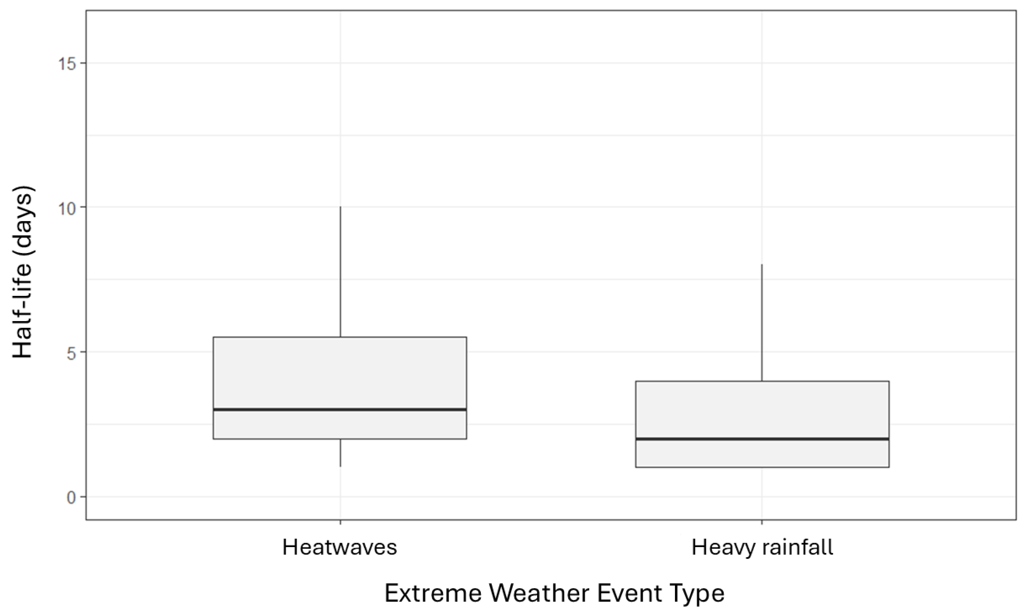 Median half-life values were short for both major event types: 3.0 days [Q1 = 2.0, Q3 = 6.3] for heatwaves and 2.0 days [Q1 = 1.0, Q3 = 4.0] for heavy rainfall. During heatwaves, the median half-life was 3 days, indicating that disruptions in waiting times typically diminished within a few days, though the wider dispersion suggests that some episodes required longer recovery. Heavy rainfall events showed a slightly shorter median half-life but with considerably larger variability, implying delayed recovery in a subset of cases. Descriptively, the three cold spell events exhibited half-life values of 1–2 days, suggesting very short-lived disruptions, but the small number of cases prevents further interpretation.