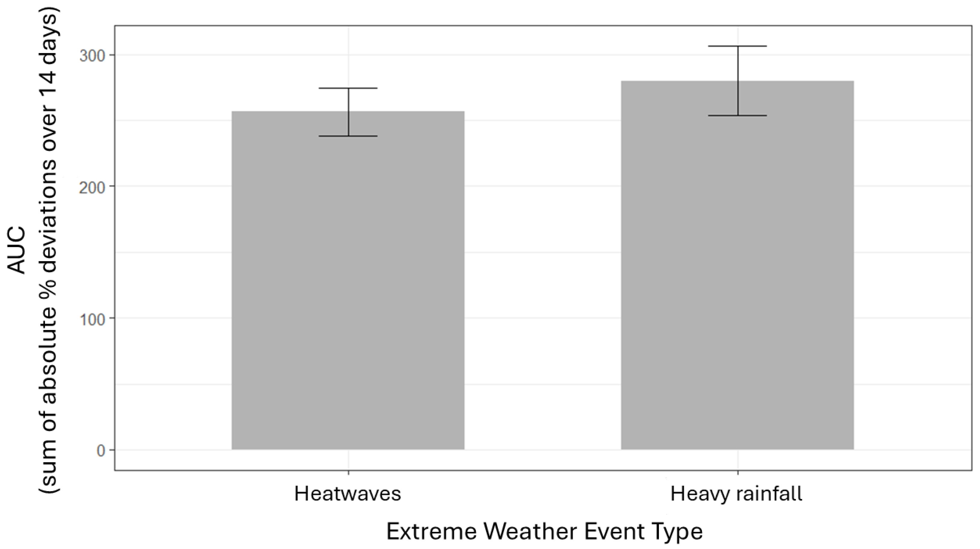 Heatwaves produced a mean AUC of approximately 255, while heavy rainfall yielded a larger average of about 285. This pattern indicates that although recovery was somewhat slower for heatwaves, the cumulative instability burden was greater under rainfall, reflecting larger fluctuations during the recovery period. Cold spells displayed average AUC values near 290, consistent with their initial shocks despite rapid recovery.