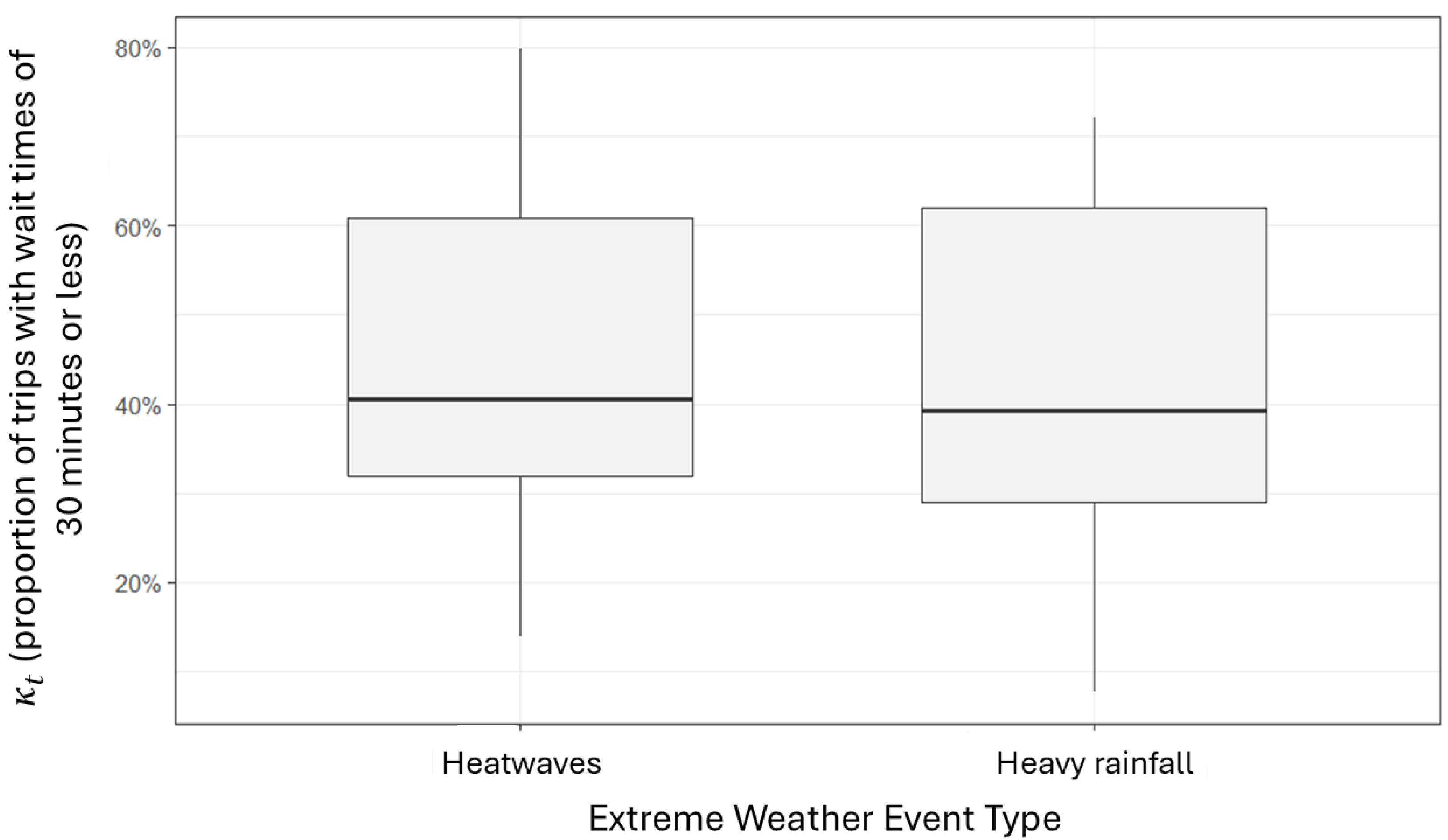 Heatwaves produced a pattern of reduced trip demand alongside shorter passenger wait times. On the surface, this outcome may suggest that service performance is preserved or even improved under high-temperature conditions. However, such improvements are largely the by-product of reduced user demand rather than operational robustness. In other words, the system appeared more efficient because fewer passengers were traveling, not because the service itself adapted effectively to heat-related stress. This reliance on suppressed demand reflects a fragile form of resilience, since climate stress does not reduce the need for essential mobility. Travel demand is known to decline during periods of extreme heat, but such behavioral adjustments cannot be interpreted as evidence of systemic robustness [