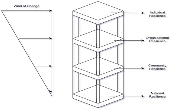 Another influential perspective on the relationship between individual and organisational resilience was advanced by Home III and Orr [], who described organisational resilience as “a fundamental quality of individuals, groups, organisations, and systems as a whole to respond productively to significant change.” Building on this view, several scholars [,,,] have conceptualised organisational resilience as a multi-dimensional and multi-level construct, shaped by an interplay of factors such as managerial resilience, group resilience, coping mechanisms, and organisational structures.