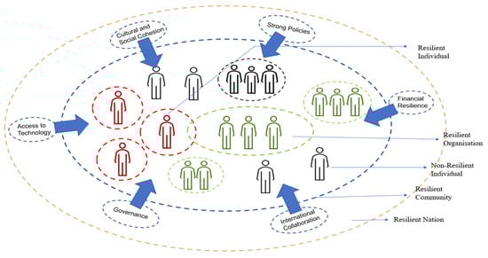 The “wind of change,” increasing in force as it moves upward, symbolises the growing intensity of disruptions at the individual level, demanding greater adaptability. While lower levels provide essential stability, weaknesses at any level can create a cascading effect, jeopardising the entire system. Since individuals may exhibit diverse resilience responses, organisations must play a unifying role by aligning employees toward shared objectives through training, well-being initiatives, strong leadership, and access to essential resources. Additionally, because the top levels experience the most instability, having a solid foundation at the national and community levels is crucial to prevent collapse. For example, New Zealand’s economy faced serious instability during COVID-19 due to border closures, shifting immigration policies, and lockdowns. This led to widespread job insecurity, restricted movement, and vaccine-related concerns, causing social unrest. According to Chifan and Ipsalat [], New Zealand ranks second globally in the Social Capital LPI Index in 2023, which evaluates the strength of interpersonal and community ties, trust in institutions, adherence to societal norms, and participation in civic life. This high ranking was reflected during the pandemic, where some communities struggled with declining trust in government policies, while others showed resilience through empathy and mutual support. Since organisations are embedded within these communities, their success was directly linked to communal strength. Supportive communities enabled businesses to survive by maintaining customer bases, adjusting wage expectations, and fostering a collaborative work culture. This created a sense of stability and resilience among employees. Any disruption at one level, whether community, organisation, or individual, can trigger a ripple effect, reinforcing the importance of stability across all sectors.
