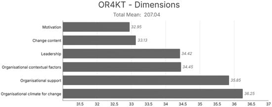 A psychometric evaluation of the instrument was also conducted to ensure the present investigation’s methodological precision. Reliability was assessed using Cronbach’s alpha coefficient, which is intended to measure internal consistency. The following results were obtained for each of the six dimensions of the OR4KT instrument: Organisational Climate for Change (α = 0.70), Organisational Contextual Factors (α = 0.84), Content of Change (α = 0.87), Leadership (α = 0.9), Organisational Support (α = 0.96), and Motivation (α = 0.80). Overall, the instrument demonstrated excellent internal consistency, with a global Cronbach’s alpha value of 0.96, indicating a high level of reliability across the instrument’s structure. Then, a Principal Component Analysis (PCA) was conducted, constrained to the extraction of six factors, using the Varimax rotation method with Kaiser normalisation. The analysis yielded a Kaiser-Meyer-Olkin (KMO) index value of 0.87, indicating a very good level of sampling adequacy and strong inter-item correlations, ultimately supporting the appropriateness of the data for factor analysis. Therefore, the questionnaire was considered valid and appropriate for use in this context.