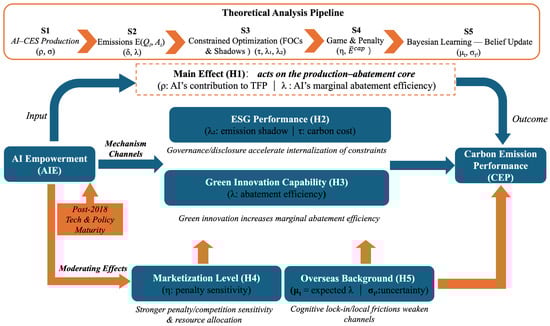 19]. These strands, while valuable, leave three gaps unaddressed: (i) a micro-level theoretical framework that embeds AI adoption into firms’ low-carbon decision-making under explicit emission constraints; (ii) identified mechanisms through which AI enhances firms’ environmental governance and stimulates green innovation capability; and (iii) empirical tests of selected mechanisms (ESG performance and green innovation) and contextual moderators (regional marketization and executives’ overseas experience), with explicit, testable links to theory.