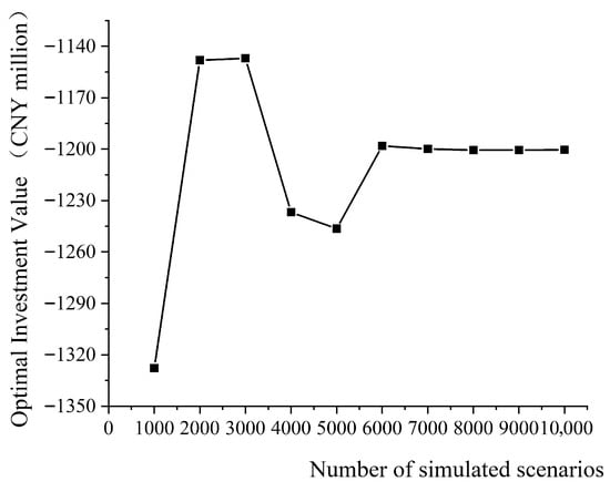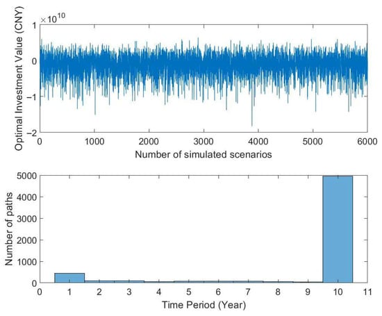 In this paper, MATLAB software computationally solves the CCUS investment model considering environmental benefits. When solving the model, the probability of occurrence of different scenarios generated by uncertainties is set to the same value, i.e., it is assumed that the probability of occurrence of the simulated scenarios is all . Figure 1 shows the variation in optimal investment value under different scenario settings. To draw more accurate conclusions, the optimal investment value for each scenario is calculated as the average value obtained from 100 simulations. It can be observed that when the number of simulated scenarios reaches approximately 6000, the results of the simulation become robust, and the calculated results stabilize. Figure 2 presents the histograms of the optimal investment value of the project and the distribution of the optimal stopping times for all paths when the scenario parameters are set to 6000. Due to the uncertainty path simulation stochasticity, the optimal value shows an overall stability of −1200.4 million CNY. This suggests that the current investment environment, which does not account for carbon trading, pollution right trading, and environmental benefits, may not immediately attract investment. Subsequent analysis will further explore investment strategies under altered conditions.